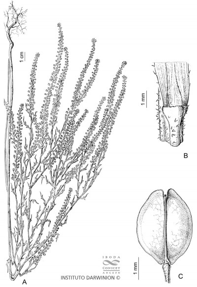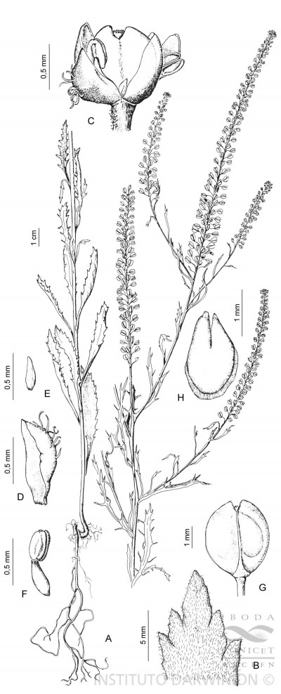 Hierbas anuales, puberulentas, con tricomas curvados, retrorsos, de 0,05-0,2 mm de largo. Tallos de (10-)20-60(-96) cm de alto, erectos, ramificados en la parte superior. Hojas basales y caulinares inferiores con pecíolos de 0,5-4 cm de largo; láminas 1-3-pinnatífidas o 1-3-pinnatisecta, estrigulosas, con tricomas de 0,2-0,5 mm de largo; lóbulos terminales ovados, oblongos, enteros, de 1-2 mm de ancho; hojas caulinares medias y superiores pecioladas o subsésiles, no auriculadas, incisas a pinnatisectas, gradualmente reducidas en tamaño y grado de división hacia el ápice de la planta. Racimos densos, alargados durante la fructificación; raquis puberulento, con tricomas generalmente curvos; pedicelos fructíferos divaricados a ascendentes, recurvados, levemente aplanados, estrechamente alados o no alados, puberulentos adaxialmente, glabros abaxialmente, de (2,5-)3-4 mm de largo. Sépalos oblongos, de 0,6-1 mm de largo, pilosos en la superficie abaxial, el ápice blanco; pétalos blancos, lineares, de 0,2-0,5 mm de largo; estambres 2, medianos; filamentos de 0,5-0,8 mm de largo; anteras de 0,15- 0,25 mm de largo. Frutos dehiscentes, generalmente elpsoideobovoides, ocasionalmente suborbiculares, de (2,5-)3-3,5 × 2,5- 3,2 mm, glabros, enervios, ápice emarginado, con alas obtusas, escotadura apical de 0,1-0,3 mm de largo; estilo de 0,05-0,15 mm de largo, inserto en la escotadura apical. Semillas castañas, ovoide-oblongoides, usualmente aladas, al menos en la porción distal, de 1,6-1,8 × 0,9-1 mm; cotiledones incumbentes.