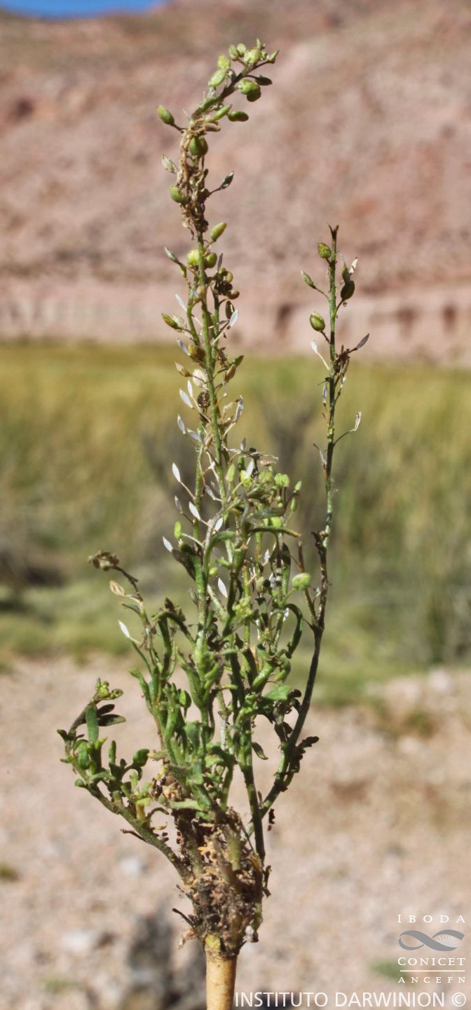 Hierbas anuales, puberulentas, con tricomas a menudo curvados de 0,05-0,25 mm de largo. Tallos de (2-)5-30(-45) cm de alto, erectos o ascendentes, generalmente ramificados en la parte superior. Hojas basales pecioladas, de 1,5-3 cm de largo, pinnatisectas; lóbulos lineares a oblongos, de 2-11 × 0,3-1 mm, enteros o 1-2-dentados; hojas caulinares medias pinnatífidas o dentadas, sésiles o con pecíolos cortos, no auriculadas; hojas caulinares superiores dentadas o enteras, no auriculadas, reducidas en tamaño hacia el ápice. Racimos laxos, alargados durante la fructificación; raquis puberulento, con tricomas a menudo curvados, rara vez glabrescente; pedicelos fructíferos delgados, teretes, divaricados a ascendentes, rectos, de 2-4 mm de largo, glabros o puberulentos sólo adaxialmente. Sépalos ovados, de 0,4-0,5 mm de largo, glabros o escasamente puberulentos, margen y ápice blancos; pétalos oblongos, de 0,1-0,2 mm de largo; estambres 2, medianos; filamentos de 0,25-0,3 mm de largo; anteras ca. 0,1 mm de largo. Frutos dehiscentes, ovoideelipsoides, de 1,5-2 × 1,3-1,5 mm, glabros, reticulados, ápice estrechamente alado; escotadura apical de 0,1-0,2 mm de largo; estilo de 0,05-0,1 mm de largo, inserto en la escotadura apical. Semillas castañas, oblongoides, de 1-1,4 × 0,5-0,6 mm, no aladas; cotiledones incumbentes.