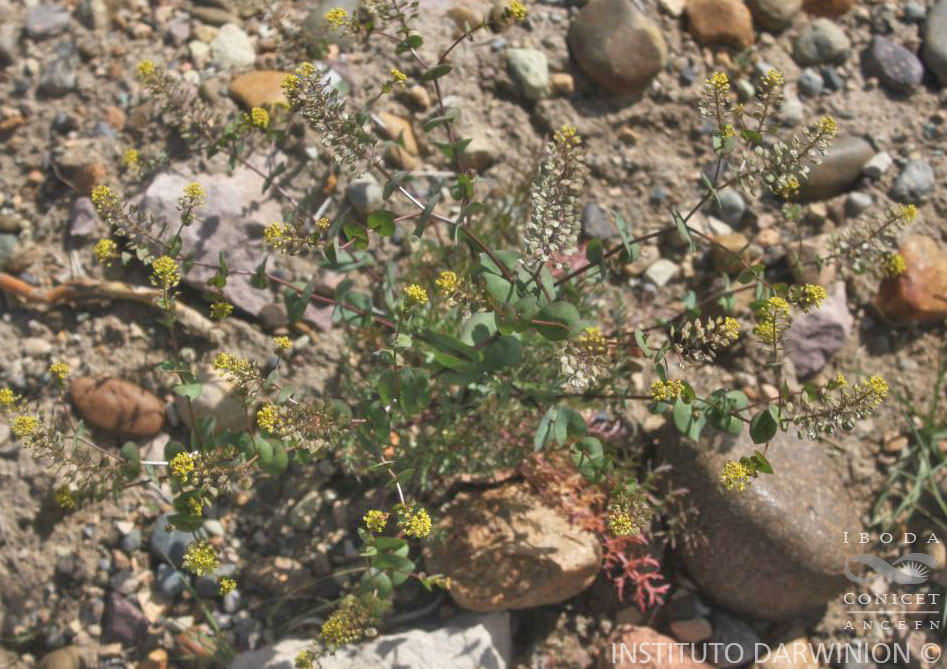 Hierbas anuales o bienales, de (7-)15-40(-65) cm de alto, glabras o con escasa pubescencia en la parte inferior, a menudo levemente glaucas. Tallos erectos, simples en la base, ramificados en la parte superior. Hojas marcadamente dimorfas. Hojas basales y caulinares inferiores con pecíolos de (0,5-)1-2(-4) cm de largo; láminas 2-3-pinnatífidas o 2-3-pinnatisectas, de (1-)3-8(-15) cm de largo, lóbulos terminales lineares o angostamente oblongos; hojas caulinares superiores sésiles; láminas ampliamente ovadas, cordadas o suborbiculares, de (0,5-)1-3(-4) × (0,5-)1- 2,5(-3,5) cm, profundamente cordado-amplexicaules, ápice agudo, margen entero. Racimos alargados durante la fructificación; pedicelos fructíferos divaricados, de 3-5(-7) mm de largo, delgados, rectos, glabros, teretes. Sépalos verde-amarillentos, oblongos, de 0,8-1(-1,3) mm de largo; pétalos amarillos, estrechamente espatulados, de 1-1,5(-1,9) × 0,2-0,5 mm, base atenuada a unguiculada con uña ca. 0,5 mm de largo; estambres 6; filamentos de 0,6-0,9 mm de largo; anteras de 0,1-0,2 mm de largo. Frutos dehiscentes, romboidales u orbiculares, de 3-4,5(-4,8) × 3-4 mm, estrechamente alados en la porción distal, alas de 0,2-0,4 mm de largo; escotadura apical hasta de 0,3 mm de largo; estilo de 0,1- 0,3 mm de largo, igual o más corto que la escotadura apical. Semillas castaño-oscuras, ovoides, de 1,6-2(-2,3) × 1,2-1,4 mm, estrechamente aladas; cotiledones incumbentes. 2n = 16.