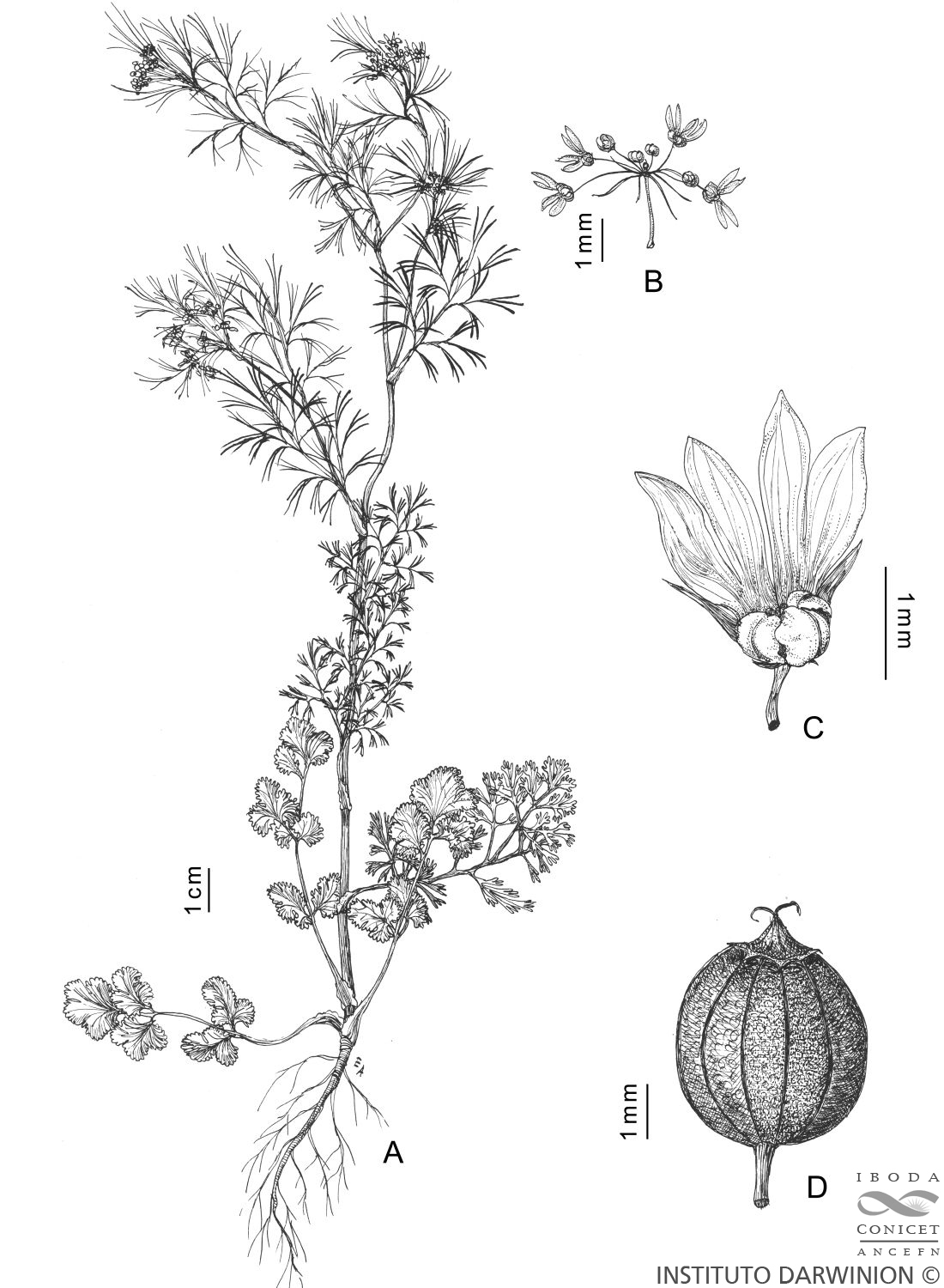 A. Planta. B. Umbélula . C. Flor. D. Fruto.