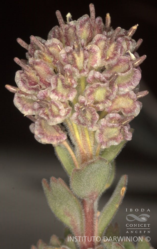 Plantas perennes, con tallos subterráneos leñosos y muy ramificados. Tallos aéreos de (5-)10-20(-32) cm de alto, herbáceos a leñosos, delgados, varios a numerosos ramificándose desde la base, erectos a subdecumbentes, ramificados o no en la parte superior, pubescentes a canescentes con tricomas simples, teretes, rectos y retrorsos o menos frecuentemente extendidos, de 0,4-1(-1,2) mm de largo. Hojas sólo caulinares, no rosuladas, subsésiles o menos frecuentemente cortamente pecioladas; láminas oblanceoladas a cuneadas, raramente obovadas, de (6-)10-20(-35) × 4-10 mm, canescentes, de cuneadas a atenuadas, márgenes enteros, ápice 3-dentado o en ocasiones 3-lobado, raro entero y entonces agudo a redondeado. Racimos terminales, ebracteados o más comúnmente con las flores inferiores bracteadas, corimbosos, densos, elongados en la fructificación, de 2-7(-10) cm largo; raquis densamente pubescente, recto; pedicelos fructíferos ascendentes, divaricados a reflexos, rectos a recurvos, de (5-)7-12(15) mm largo, hirsutos. Sépalos oblongos, de (2,5-)4-5,5(-6.5) × (1,2-)1,5-2(-2,3) mm, pubescentes, erectos, no saccciformes, caducos, con los márgenes escariosos; pétalos blancos a blanco-cremosos, en ocasiones levemente purpúreos, espatulados, de (4-)6-10(-12) × (1,5-)2- 2.5 mm, con uña diferenciada, sin papilas en la base; estambres tetradínamos; anteras angostamente oblongoides, de (0,8-)1,1- 1,6(-2) mm de largo, sagitadas en la base; filamentos libres, erectos, levemente dilatados y sin papilas en la base, de (2-)4-5(-7) mm de largo; glándulas nectaríferas confluentes, rodeando la base de todos los filamentos. Frutos suborbiculares a elipsoides, glabros a hirsutos; valvas 3, 5 (-7)-aladas, con nervios trasversales leve a conspicuamente marcados, de (4-)5-8(-11) × (3-)5-8(-10) mm, emarginadas en el ápice; alas laterales y dorsal similares, de (0,5-)1,1-2,5(-3,5) mm de ancho; ginóforo de 0,5-1,8 mm de largo; estilo de (1-)1,5-3,5(-4,5) mm de largo; estigma subdecurrente. Semillas oblongoides a ovoides, de (2-)2,5-4 × (1,2-)1,8-3 mm, no aladas, aplanadas; cotiledones acumbentes.