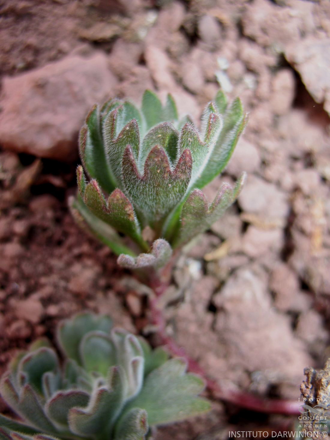 Plantas perennes, con tallos subterráneos leñosos y muy ramificados. Tallos aéreos de (5-)10-20(-32) cm de alto, herbáceos a leñosos, delgados, varios a numerosos ramificándose desde la base, erectos a subdecumbentes, ramificados o no en la parte superior, pubescentes a canescentes con tricomas simples, teretes, rectos y retrorsos o menos frecuentemente extendidos, de 0,4-1(-1,2) mm de largo. Hojas sólo caulinares, no rosuladas, subsésiles o menos frecuentemente cortamente pecioladas; láminas oblanceoladas a cuneadas, raramente obovadas, de (6-)10-20(-35) × 4-10 mm, canescentes, de cuneadas a atenuadas, márgenes enteros, ápice 3-dentado o en ocasiones 3-lobado, raro entero y entonces agudo a redondeado. Racimos terminales, ebracteados o más comúnmente con las flores inferiores bracteadas, corimbosos, densos, elongados en la fructificación, de 2-7(-10) cm largo; raquis densamente pubescente, recto; pedicelos fructíferos ascendentes, divaricados a reflexos, rectos a recurvos, de (5-)7-12(15) mm largo, hirsutos. Sépalos oblongos, de (2,5-)4-5,5(-6.5) × (1,2-)1,5-2(-2,3) mm, pubescentes, erectos, no saccciformes, caducos, con los márgenes escariosos; pétalos blancos a blanco-cremosos, en ocasiones levemente purpúreos, espatulados, de (4-)6-10(-12) × (1,5-)2- 2.5 mm, con uña diferenciada, sin papilas en la base; estambres tetradínamos; anteras angostamente oblongoides, de (0,8-)1,1- 1,6(-2) mm de largo, sagitadas en la base; filamentos libres, erectos, levemente dilatados y sin papilas en la base, de (2-)4-5(-7) mm de largo; glándulas nectaríferas confluentes, rodeando la base de todos los filamentos. Frutos suborbiculares a elipsoides, glabros a hirsutos; valvas 3, 5 (-7)-aladas, con nervios trasversales leve a conspicuamente marcados, de (4-)5-8(-11) × (3-)5-8(-10) mm, emarginadas en el ápice; alas laterales y dorsal similares, de (0,5-)1,1-2,5(-3,5) mm de ancho; ginóforo de 0,5-1,8 mm de largo; estilo de (1-)1,5-3,5(-4,5) mm de largo; estigma subdecurrente. Semillas oblongoides a ovoides, de (2-)2,5-4 × (1,2-)1,8-3 mm, no aladas, aplanadas; cotiledones acumbentes.