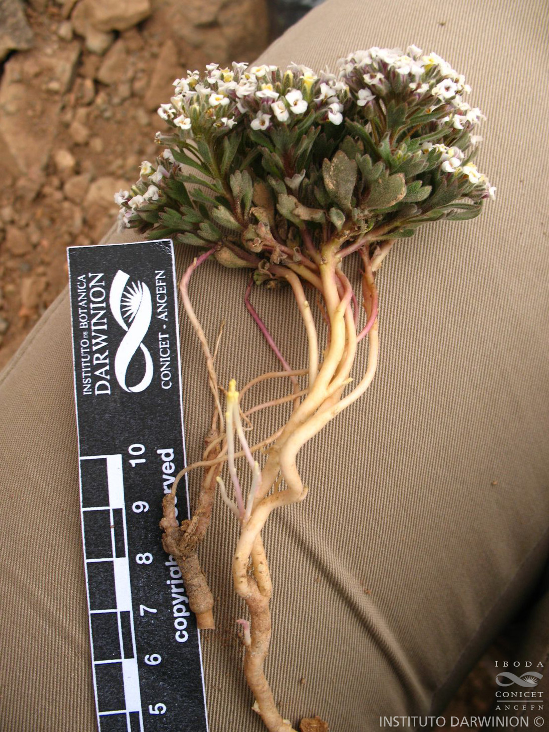 Plantas perennes, con tallos subterráneos leñosos y muy ramificados. Tallos aéreos de (5-)10-20(-32) cm de alto, herbáceos a leñosos, delgados, varios a numerosos ramificándose desde la base, erectos a subdecumbentes, ramificados o no en la parte superior, pubescentes a canescentes con tricomas simples, teretes, rectos y retrorsos o menos frecuentemente extendidos, de 0,4-1(-1,2) mm de largo. Hojas sólo caulinares, no rosuladas, subsésiles o menos frecuentemente cortamente pecioladas; láminas oblanceoladas a cuneadas, raramente obovadas, de (6-)10-20(-35) × 4-10 mm, canescentes, de cuneadas a atenuadas, márgenes enteros, ápice 3-dentado o en ocasiones 3-lobado, raro entero y entonces agudo a redondeado. Racimos terminales, ebracteados o más comúnmente con las flores inferiores bracteadas, corimbosos, densos, elongados en la fructificación, de 2-7(-10) cm largo; raquis densamente pubescente, recto; pedicelos fructíferos ascendentes, divaricados a reflexos, rectos a recurvos, de (5-)7-12(15) mm largo, hirsutos. Sépalos oblongos, de (2,5-)4-5,5(-6.5) × (1,2-)1,5-2(-2,3) mm, pubescentes, erectos, no saccciformes, caducos, con los márgenes escariosos; pétalos blancos a blanco-cremosos, en ocasiones levemente purpúreos, espatulados, de (4-)6-10(-12) × (1,5-)2- 2.5 mm, con uña diferenciada, sin papilas en la base; estambres tetradínamos; anteras angostamente oblongoides, de (0,8-)1,1- 1,6(-2) mm de largo, sagitadas en la base; filamentos libres, erectos, levemente dilatados y sin papilas en la base, de (2-)4-5(-7) mm de largo; glándulas nectaríferas confluentes, rodeando la base de todos los filamentos. Frutos suborbiculares a elipsoides, glabros a hirsutos; valvas 3, 5 (-7)-aladas, con nervios trasversales leve a conspicuamente marcados, de (4-)5-8(-11) × (3-)5-8(-10) mm, emarginadas en el ápice; alas laterales y dorsal similares, de (0,5-)1,1-2,5(-3,5) mm de ancho; ginóforo de 0,5-1,8 mm de largo; estilo de (1-)1,5-3,5(-4,5) mm de largo; estigma subdecurrente. Semillas oblongoides a ovoides, de (2-)2,5-4 × (1,2-)1,8-3 mm, no aladas, aplanadas; cotiledones acumbentes.