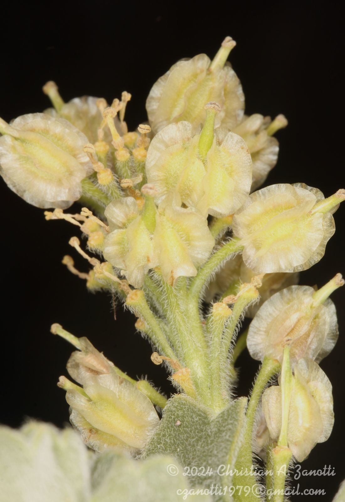Plantas perennes, con tallos subterráneos leñosos y muy ramificados. Tallos aéreos de (5-)10-20(-32) cm de alto, herbáceos a leñosos, delgados, varios a numerosos ramificándose desde la base, erectos a subdecumbentes, ramificados o no en la parte superior, pubescentes a canescentes con tricomas simples, teretes, rectos y retrorsos o menos frecuentemente extendidos, de 0,4-1(-1,2) mm de largo. Hojas sólo caulinares, no rosuladas, subsésiles o menos frecuentemente cortamente pecioladas; láminas oblanceoladas a cuneadas, raramente obovadas, de (6-)10-20(-35) × 4-10 mm, canescentes, de cuneadas a atenuadas, márgenes enteros, ápice 3-dentado o en ocasiones 3-lobado, raro entero y entonces agudo a redondeado. Racimos terminales, ebracteados o más comúnmente con las flores inferiores bracteadas, corimbosos, densos, elongados en la fructificación, de 2-7(-10) cm largo; raquis densamente pubescente, recto; pedicelos fructíferos ascendentes, divaricados a reflexos, rectos a recurvos, de (5-)7-12(15) mm largo, hirsutos. Sépalos oblongos, de (2,5-)4-5,5(-6.5) × (1,2-)1,5-2(-2,3) mm, pubescentes, erectos, no saccciformes, caducos, con los márgenes escariosos; pétalos blancos a blanco-cremosos, en ocasiones levemente purpúreos, espatulados, de (4-)6-10(-12) × (1,5-)2- 2.5 mm, con uña diferenciada, sin papilas en la base; estambres tetradínamos; anteras angostamente oblongoides, de (0,8-)1,1- 1,6(-2) mm de largo, sagitadas en la base; filamentos libres, erectos, levemente dilatados y sin papilas en la base, de (2-)4-5(-7) mm de largo; glándulas nectaríferas confluentes, rodeando la base de todos los filamentos. Frutos suborbiculares a elipsoides, glabros a hirsutos; valvas 3, 5 (-7)-aladas, con nervios trasversales leve a conspicuamente marcados, de (4-)5-8(-11) × (3-)5-8(-10) mm, emarginadas en el ápice; alas laterales y dorsal similares, de (0,5-)1,1-2,5(-3,5) mm de ancho; ginóforo de 0,5-1,8 mm de largo; estilo de (1-)1,5-3,5(-4,5) mm de largo; estigma subdecurrente. Semillas oblongoides a ovoides, de (2-)2,5-4 × (1,2-)1,8-3 mm, no aladas, aplanadas; cotiledones acumbentes.