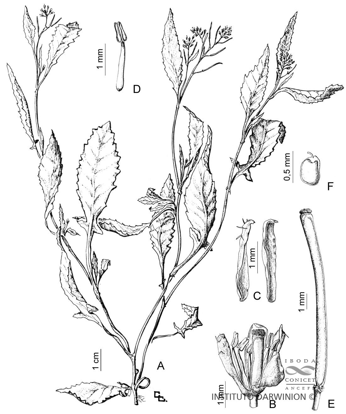 Hierbas anuales, glabras, rara vez esparcidamente pubescentes. Tallos de (4-)15-33(-45) cm de alto, erectos o ascendentes, simples o ramificados en las partes inferior y superior, la porción inferior es glabra o esparcidamente pubescente. Hojas basales no rosuladas, tempranamente marchitas; hojas caulinares inferiores y medias pecioladas, con pecíolos hasta de 4 cm de largo, o sésiles, auriculadas o no, lirado-pinnatipartidas o no divididas, obovadas, oblongas o lanceoladas, de (2-)3-11(- 15) × (0,5-)1-3(-5) cm, margen entero o irregularmente crenado o serrado; lóbulos laterales presentes o ausentes, más pequeños que el lóbulo lateral; hojas caulinares superiores usualmente sésiles, auriculadas o no, enteras o serruladas. Racimos ebracteados, alargados; pedicelos fructíferos divaricados, de (2- )3-8(-10) mm de largo, delgados, rectos. Sépalos oblongo-lineares, de (2-)2,5,3 × 0,5-0,7 mm, erectos, deciduos; pétalos ausentes, rara vez presentes y entonces lineares o angostamente oblanceolados, de 1-1,5 × 0,2-0,7 mm, más cortos que los sépalos; filamentos medianos de 1,5-2,8 mm de largo; anteras oblongoides, de 0,5-0.8 mm de largo; óvulos 70-90. Frutos silicuas, lineares, de (1,5-)2,5-4 cm × 0,7-0,9(-1) mm, rectas; valvas glabras; septo completo; estilo de 0,2-1(-1,5) mm de largo, igual de robusto que el fruto. Semillas 1-seriadas, castaño-rojizas, ovoideorbiculares, de 0,5-0,8 × 0,4-0,6 mm, foveoladas. 2n = 32, 48.