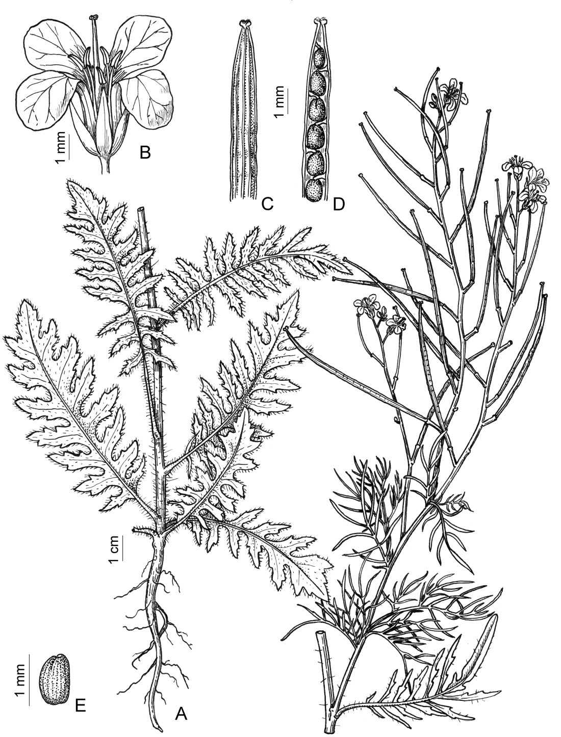 A. Planta, porción inferior y raiz (izquierda), porción superior florífera y fructífera (derecha). B. Flor. C. Silicua, porción apical. D. Silicua, corte longitudinal de la porción apical. E. Semilla.