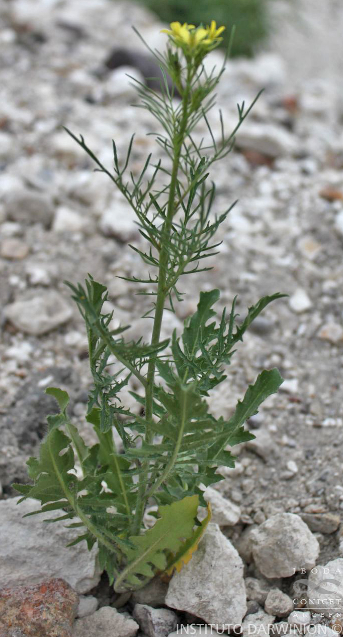 Hierbas anuales, de (20-)40-120(-160) cm de alto. Tallos erectos, ramificados en la parte superior, escasa a densamente hirsutos cerca de la base, glabros o subglabros en la parte superior. Hojas basales rosuladas; pecíolos de 1-10(-15) cm de largo; láminas ampliamente oblanceoladas, oblongas o lanceoladas, pinnatisectas, pinnatífidas o runcinadas, de (2-)5-20(-35) × (1-)2- 8(-10) cm; lóbulos laterales (3-)4-6(-8) a cada lado del nervio central, más pequeños que el lóbulo terminal, oblongos o lanceolados, enteros, dentados o lobulados. Hojas caulinares superiores con lóbulos estrechamente lineares a filiformes. Pedicelos fructíferos divaricados, rara vez ascendentes, robustos, casi tan gruesos como el fruto, de (4-)6-10(-13) mm de largo. Sépalos oblongos, cuculados, ascendentes o extendidos de 4-6 mm de largo; pétalos amarillos, espatulados, de (5-)6-8(- 10) × 2,5-4 mm, uña subigual a los sépalos; anteras oblongoides, de 1,5-2,2 mm de largo; filamentos amarillentos, erectos, de 2-6 mm de largo; óvulos 90-120. Frutos angostamente lineares, robustos, teretes, de (4,5-)6-9(-12) cm × 1-2 mm, usualmente rectos; valvas glabras, lisas; estilo subclaviforme, de 0,5-2 mm de largo; estigma prominentemente 2-lobulado; septo ligeramente engrosado. Semillas oblongoides, de 0,8-1 × 0,5-0,6 mm, insertas en las depresiones del septo.
