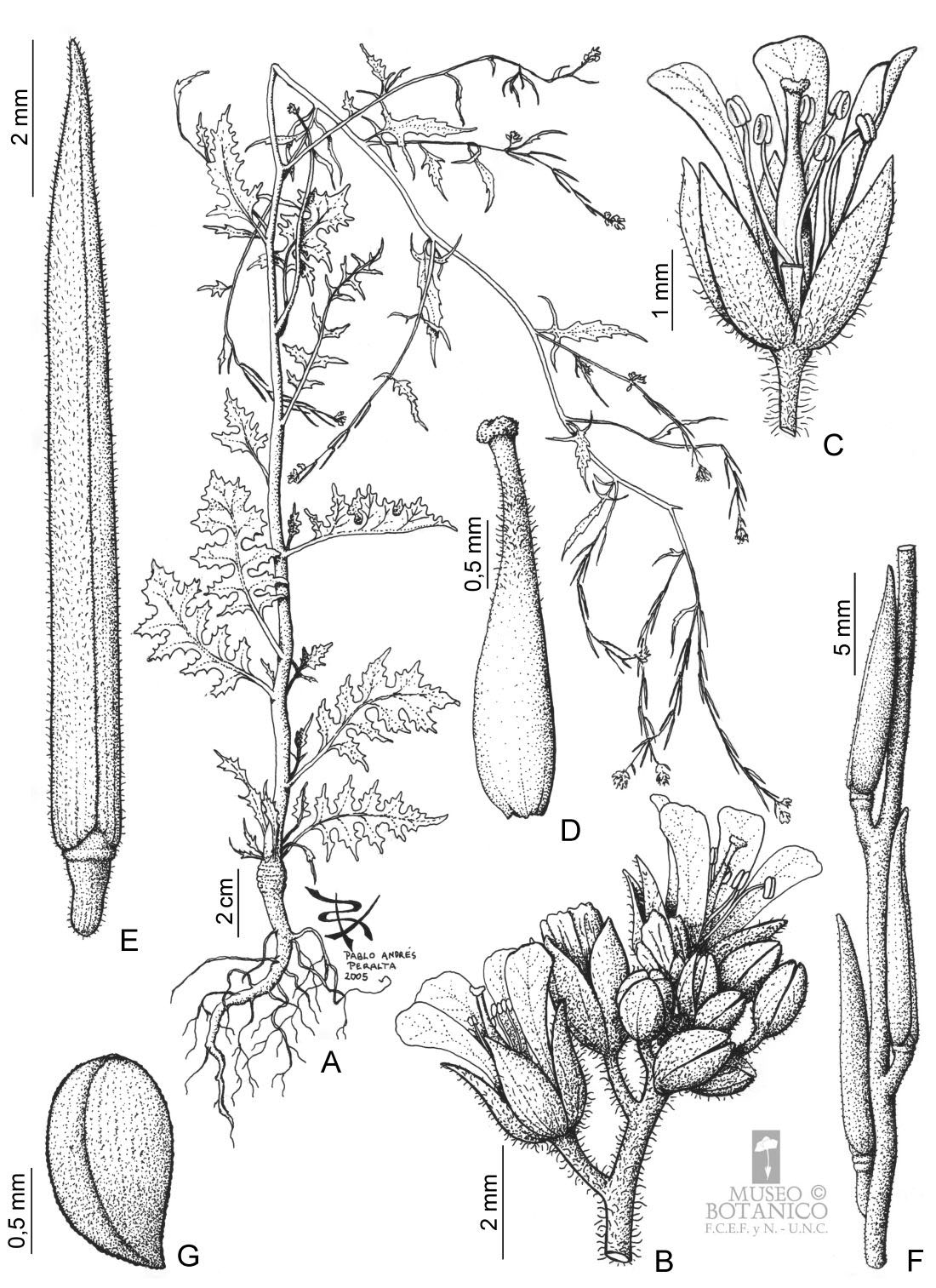 A. Planta. B. Rama florífera. C. Flor. D. Gineceo. E. Silicua. F. Rama fructífera. G. Semilla.