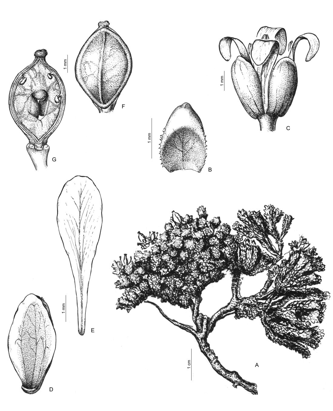 Plantas perennes, con las ramas superiores de 2-5 cm de alto; cáudice hasta de 1 cm de diámetro, ramas cubiertas con hojas persistentes de los años anteriores. Hojas densamente imbricadas, rectas, oblongo-ovadas, rígidas, de (1,5-)2-3,5 × 1- 1,6 mm, glabras excepto por el margen ciliado, abaxialmente no carinadas, nervio central poco manifiesto, adaxialmente cóncavas a casi planas, no expandidas en la base, ápice obtuso, margen ciliado en la mitad proximal, con tricomas simples, dispersos, ca. 0,05 mm de largo. Pedicelos fructíferos delgados, de 2-4 mm de largo, glabros. Sépalos oblongos, de 3,5-5 × 1,4-1,8 mm, ligeramente carnosos en el centro, erecto-ascendentes, glabros, margen membranáceo; pétalos amarillo-pálidos, estrechamente espatulados, de 8-10 × 1-1,7 mm, ápice redondeado, uña delgada, no apendiculada; filamentos de 4-5 mm de largo, no expandidos en la base; anteras oblongoides, de 1-1,2 mm de largo; óvulos 4-6. Frutos elipsoides, de 4-6 × 2,5-3,5 mm; valvas coriáceas, carinadas; estilo de 0,2-0,5 mm de largo. Semillas de 2-3 × 1,2-1,5 mm.