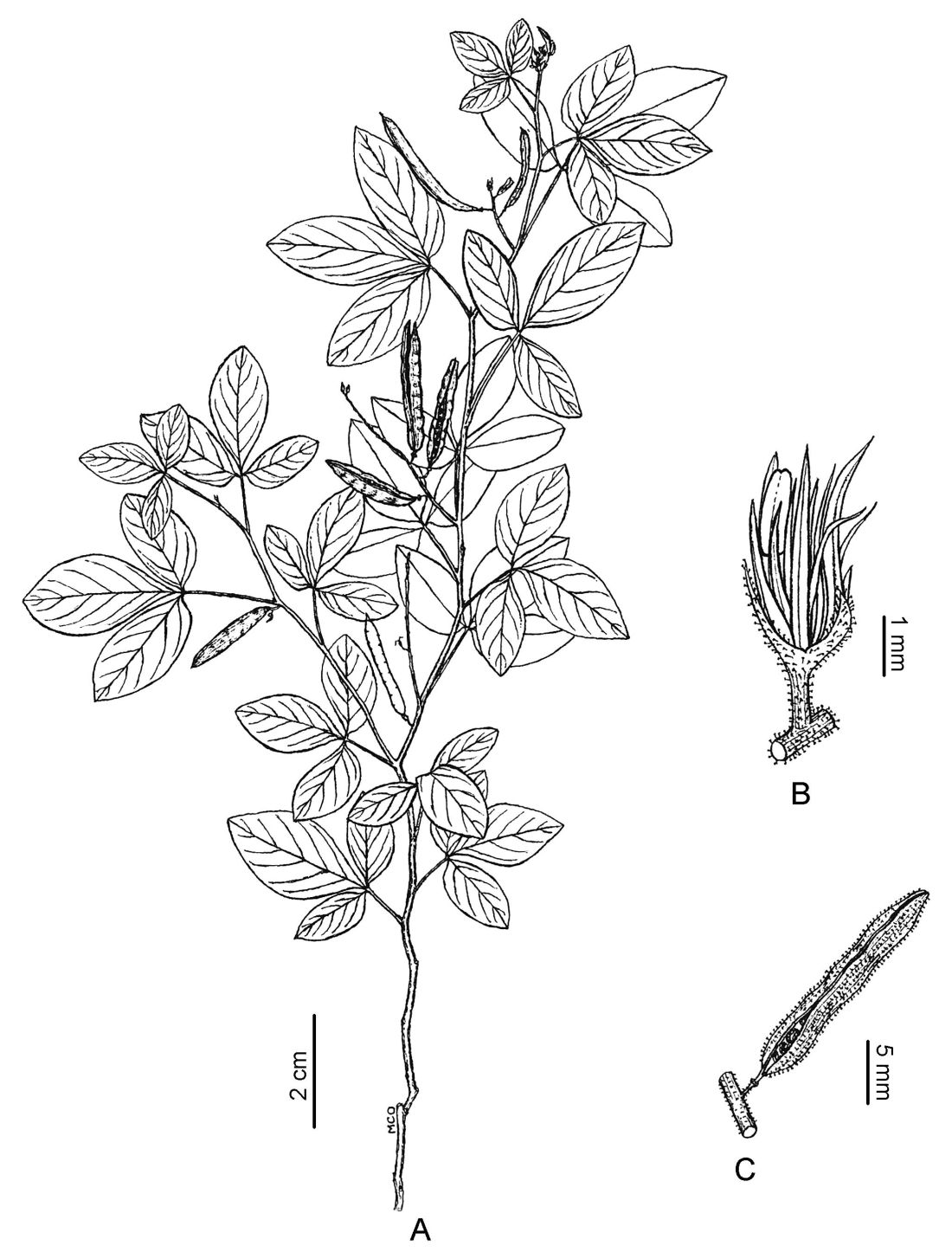 A. Rama florífera y fructífera. B. Flor. C. Fruto. Tomado de Aportes Bot. Salta, Ser. Flora 1(15): 12, lám. 2. 1992.