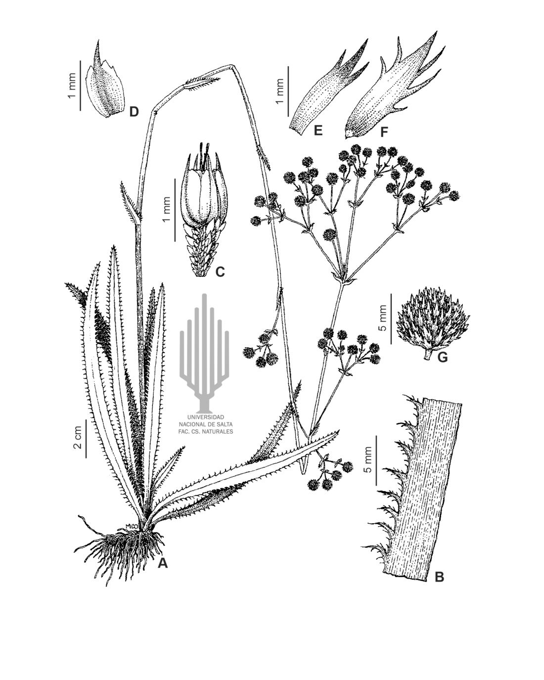 Hierbas perennes, de 0,5-1,5 m de alto; rizoma corto, oblicuo, con raíces fasciculadas negras. Tallo primario erecto, grácil a robusto, ramificado en un pleocasio terminal amplio y algunas cimas laterales menores por debajo. Hojas basales tendidas o ascendentes, coriáceas, sésiles; láminas angostamente ovadas o angostamente obovadas, de 10-30 × 1-3 cm, ápice agudo, margen serrado a dentado espinoso, con o sin cilias entre los dientes, vaina inerme, poco dilatada; venas paralelas en el centro de la lámina, divergentes y reticuladas hacia los márgenes; hojas caulinares y profilos reducidos, hasta de 6 cm de largo. Capítulos blancos, anchamente ovoides o globosos, de 5-10 mm; involucro inconspicuo; brácteas involucrales 6-10, ascendentes, ovadas, de 5-8 mm de largo, espinuloso-dentadas; brácteas florales 3-dentadas, más largas que los frutos. Flores blancas. Frutos de 2-2,5 × 1-2 mm, mericarpios con escamas laterales y calicinales conspicuas, aplanadas, aliformes, y las dorsales vesiculares, pequeñas.