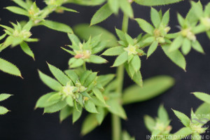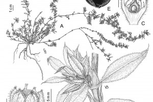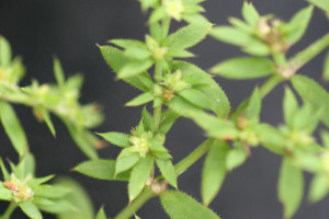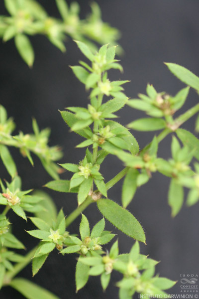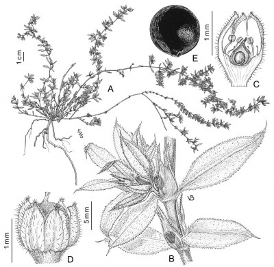 Hierbas perennes, a veces bienales o anuales; tallo postrado o decumbente, de (15-)20-30(-45) cm de largo, densamente ramificado, entrenudos ca. 20 mm de largo. Hojas elíptico-lanceoladas, de 0,5-4,5 × 0,1-1,5 cm, agudas a acuminadas, generalmente con una arista de 0,4-0,8 mm de largo, 1-nervadas, hirsutas, raramente glabras; subsésiles. Inflorescencias formadas por 3-7 flores o solitarias. Flores ovoideas, de 1,5-2,4 mm de largo; pedicelos de (1,2-)1,6-2,4 mm de largo; brácteas lanceoladas, que exceden en longitud a las flores; receptáculo obcónico, de 0,4-0,5 mm de largo, estriado, verdoso; cáliz membranáceo o herbáceo; sépalos oblongos, de 1-1,2 × 0,4-0,5 mm de largo, marcadamente 3-nervados, hirsutos, verdosos en la mitad basal y rojizos en la mitad apical, arista de 0,2-0,4 mm de largo; pétalos de (0,2-)0,4-0,5 mm de largo, castaños a rojizos; estambres iguales o algo más largos que los pétalos, filamentos de 0,4-0,5 mm de largo, anteras de 0,1-0,2 mm de largo; ovario ovoide, ca. 0,5 mm de largo, marcadamente papiloso; estilo de 0,3-0,4 mm de largo, 2-fido hasta la mitad, con ramas erectas. Fruto de 1-1,2 × 1 mm, marcadamente papiloso, con el estilo generalmente exerto del cáliz. Semilla ca. 1 × 1 mm. Var. communis.- Flores generalmente hasta de 2 mm de largo, sépalos con las aristas de 0,2-0,3 mm de largo.