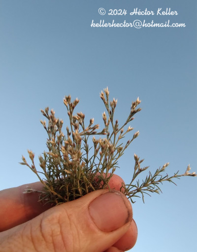Hierba anual; tallos erectos, cilíndricos, hasta de 40-50 cm de alto, ramificados desde la base, ± pilosos. Hojas pseudoverticiladas, lineares a aciculares, de 15-20 × 0,5-1 mm, a veces recurvas; base atenuada, ápice agudo y margen entero, piloso; estípulas lanceoladas, de 2-4 mm de largo, con el margen hialino. Inflorescencias en cimas terminales; brácteas 4-5, lanceoladas, de 2,4-3,4 mm de largo, membranosas, hialinas. Flores con pedicelo hasta de 3 mm de largo; sépalos lanceolados, de 2,2-3,2 mm de largo, hialinos, glabros y acuminados; pétalos ovados, de 0,3-0,5 mm de largo, libres, rosados a castaño-rojizos; estambres generalmente 5, de 0,4 mm de largo, libres; ovario ovoide, de 0,5-1,2 mm de largo; estilo corto. Fruto una cápsula ovoide, de 1,5 mm de largo, castaña. Semillas planas, de 0,3-0,5 mm de diámetro, pardas, reticuladas.