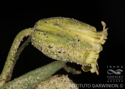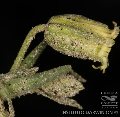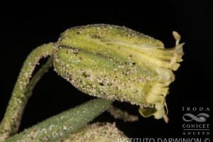 Hierba perenne, laxa a densamente cespitosa, con estolones cortos a largos y cáudice leñoso, alargado, formando rosetas de hojas, con estolones numerosos, alargados; tallos varios, simples, erectos, de 5-25 cm de alto, cubiertos por tricomas glandulares cortos, portando 1-3 pares de hojas o sin hojas, a tallos ausentes. Hojas basales lineares o estrechamente lanceoladas, de (15-)30-60 × (1-)2-5(-7) mm, agudas o a veces subobtusas, glabras o ± pubescentes en las caras, el margen y las nervaduras pilosas; hojas caulinares lineares, gradualmente más pequeñas. Flores solitarias, raro en cimas hasta de 5 flores, nutantes hasta la floración; pedúnculos de 0,5-3 cm de largo; cáliz campanulado, de 8-10(-15) mm de largo, cubierto por tricomas cortos, glandulares, 10-nervado, con dientes triangulares de 6-7 mm de largo, agudos, con tricomas blancos conspicuos en el margen; pétalos verde-glaucos, uña de 6 mm de largo, el limbo redondeado o truncado, de 1-2 mm de largo, sobresaliendo unos 2-3 mm por encima del cáliz, con 2 aurículas y 2 escamas coronales reducidas; estambres con filamento glabro; ovario ovoide, ca. 3 mm de largo, estilos 5, a veces 3; carpóforo breve, glabro o casi glabro. Cápsula ovoidea, ca. 9 mm de largo, dehiscente por (6-)10 dientes. Semillas reniformes, pequeñas, ca 1,5 mm de ancho, pardas, las caras tuberculadas. Var. densa.- Hierba densamente cespitosa; estolones cortos; tallos de menos de 10 cm de alto, sin hojas o tallos ausentes.