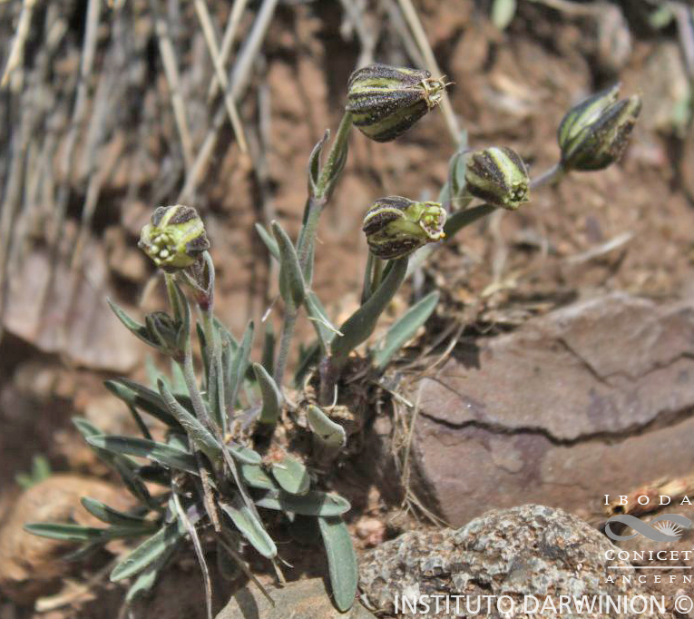 Hierba perenne, laxa a densamente cespitosa, con estolones cortos a largos y cáudice leñoso, alargado, formando rosetas de hojas, con estolones numerosos, alargados; tallos varios, simples, erectos, de 5-25 cm de alto, cubiertos por tricomas glandulares cortos, portando 1-3 pares de hojas o sin hojas, a tallos ausentes. Hojas basales lineares o estrechamente lanceoladas, de (15-)30-60 × (1-)2-5(-7) mm, agudas o a veces subobtusas, glabras o ± pubescentes en las caras, el margen y las nervaduras pilosas; hojas caulinares lineares, gradualmente más pequeñas. Flores solitarias, raro en cimas hasta de 5 flores, nutantes hasta la floración; pedúnculos de 0,5-3 cm de largo; cáliz campanulado, de 8-10(-15) mm de largo, cubierto por tricomas cortos, glandulares, 10-nervado, con dientes triangulares de 6-7 mm de largo, agudos, con tricomas blancos conspicuos en el margen; pétalos verde-glaucos, uña de 6 mm de largo, el limbo redondeado o truncado, de 1-2 mm de largo, sobresaliendo unos 2-3 mm por encima del cáliz, con 2 aurículas y 2 escamas coronales reducidas; estambres con filamento glabro; ovario ovoide, ca. 3 mm de largo, estilos 5, a veces 3; carpóforo breve, glabro o casi glabro. Cápsula ovoidea, ca. 9 mm de largo, dehiscente por (6-)10 dientes. Semillas reniformes, pequeñas, ca 1,5 mm de ancho, pardas, las caras tuberculadas. Var. densa.- Hierba densamente cespitosa; estolones cortos; tallos de menos de 10 cm de alto, sin hojas o tallos ausentes.