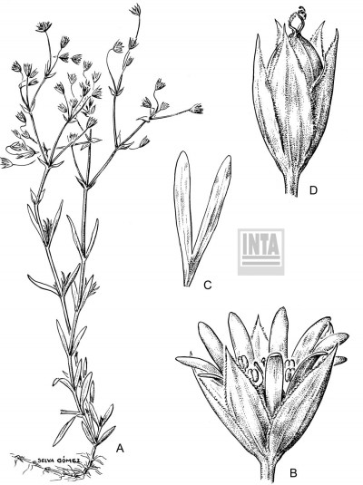 Hierba perenne con el tallo 4-angular, el principal tendido y radicante y con ramificaciones erectas y robustas. Hojas lineares, linear-lanceoladas, de ápice agudo, de 0,5-2 x 0,1-0,3 cm, ciliadas cerca de la base. Inflorescencias en cimas terminales laxas con brácteas escariosas; flores con pedicelo hasta de 50 mm de largo; sépalos de 3-5,5 mm de largo, agudos, ciliados; pétalos generalmente de ca. 1 1/2 veces más largos que los sépalos, 2-partidos desde la hasta cerca de la base; estambres 10; estilos 3, de 1,5-2 mm de largo. Fruto algo más larga que el cáliz. Semillas de (1-)1,2-1,3 mm de diámetro, con tubérculos alargados y arrugados