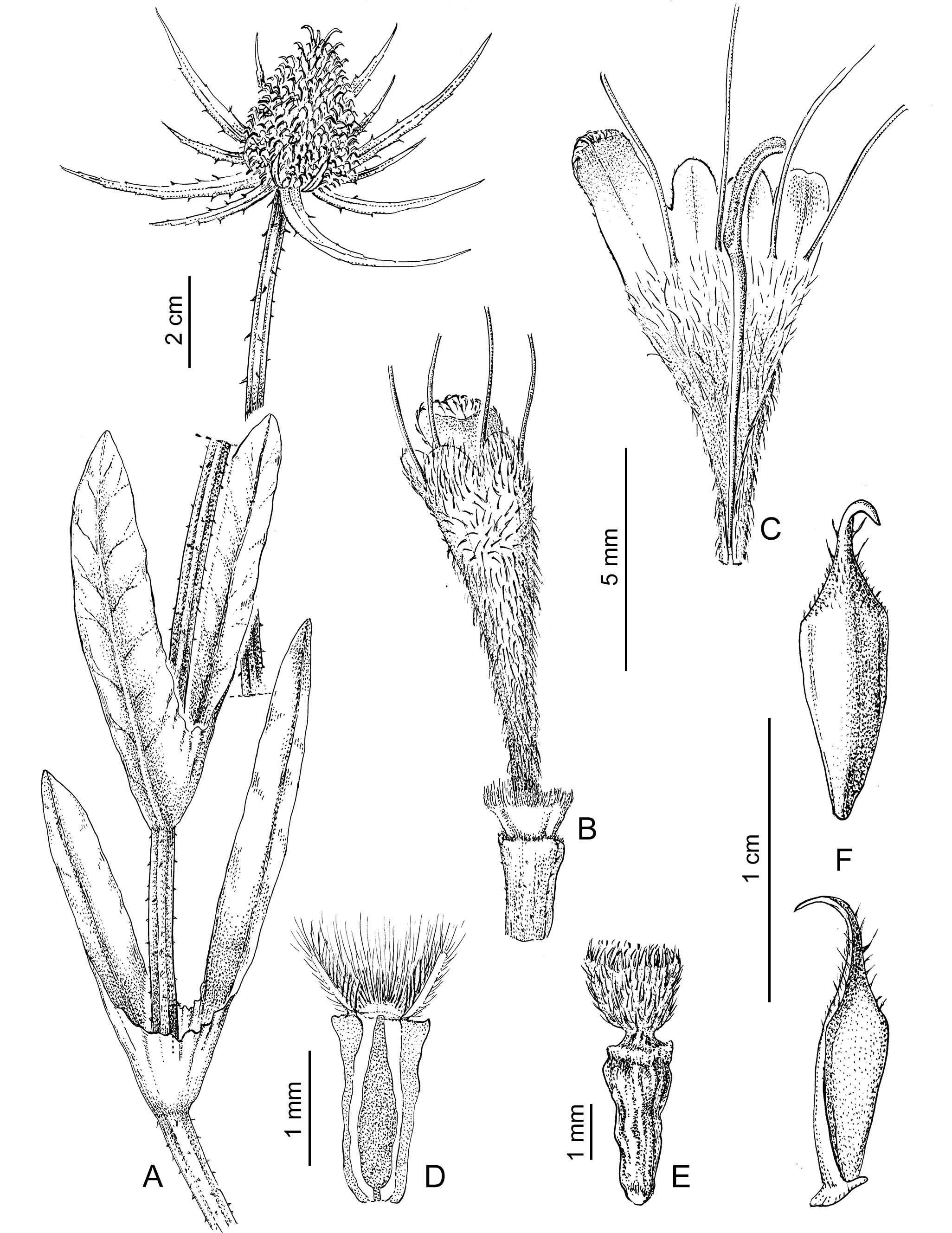 Hierbas bienales hasta de 180 cm de alto. Tallos erectos, acostillados, huecos, simples o más generalmente ramificados en la parte superior, con aguijones cortos, rectos o algo curvados y retrorsos, más densos debajo de las inflorescencias. Hojas basales dispuestas en roseta, simples, brevemente pecioladas o sésiles, con lámina oblongo-lanceolada u oblongo-elíptica, de 15-20 × 5 cm, margen entero o a veces irregularmente crenado o dentado, con nervadura principal prominente en el envés, con aguijones. Hojas superiores sésiles, angostamente ovadas, de 5-7 × 1,5-2,5 cm, connatas en la base. Inflorescencias en capítulos globosos, ovoides u ovoide-cilíndricos, de 25-80 × 19-40 mm; pedúnculos hasta de 26 cm de largo; receptáculo cilíndrico, glabro. Brácteas del involucro subuladas, hasta de 6 cm de largo, muy desiguales, coriáceas, ligeramente curvadas, ascendentes. Bractéolas oblongoespatuladas, de 11-13 mm de largo, abruptamente contraídas en un extremo punzante marcadamente rígido y uncinado. Flores perfectas. Involucelo con tubo surcado por 8 costillas ± desarrolladas por igual, con pelos dirigidos hacia arriba, abundantes entre las costillas. Corola de 8-10,5 mm de largo, violeta o rosadoviolácea, pubescente en la cara externa y en la garganta; tubo de 6,7-8 mm de largo; lóbulos de 1,3-2,5 mm de largo, pubéruloglandulosos en la cara interna. Frutos secos de 3-4 mm de largo, con 4-8 costillas, híspidos, con cáliz persistente en el ápice.