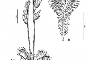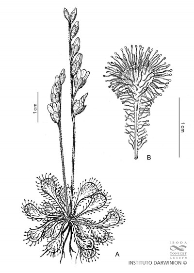 Hierba acaulescente de 4-12 cm de alto. Hojas de 6-19 mm de largo, en roseta, adpresas al suelo, vinosas; láminas obovadas a espatuladas, de 2-10 × 2-6 mm, ápice obtuso, márgenes y cara adaxial con emergencias glandulares (tentáculos), superficie abaxial con escasos tricomas glandulares y filamentosos o glabros; pecíolos de 3,5-11 × 0,5-1,5 mm, apenas diferenciados de la lámina, glabros en la cara adaxial; estípulas ausentes o si presentes muy reducidas y laterales. Inflorescencia 1-(4) por planta, de 2-9 cm de largo, vinosa, flores (1)-2-6(-9); pedúnculos erectos de 1,5-6 cm de largo, con tricomas glandulares; brácteas lineares ca. 3 mm de largo, superficie adaxial glabra, la abaxial con tricomas glandulares; pedicelos vinosos, con tricomas glandulares. Flores con sépalos ovados de 2,5-5 × 1-2 mm, unidos en la base, con tricomas glandulares en la cara externa; pétalos espatulados de 4-7 × 1-2 mm, blancos a rosados; estambres de 2-2,5 mm de largo; ovario 3-carpelar, con 3 estilos 2-partidos cerca de la base, estigmas 6, clavados. Semillas elipsoides, de 0,2-0,3 × 0,1-0,2, foveoladas.