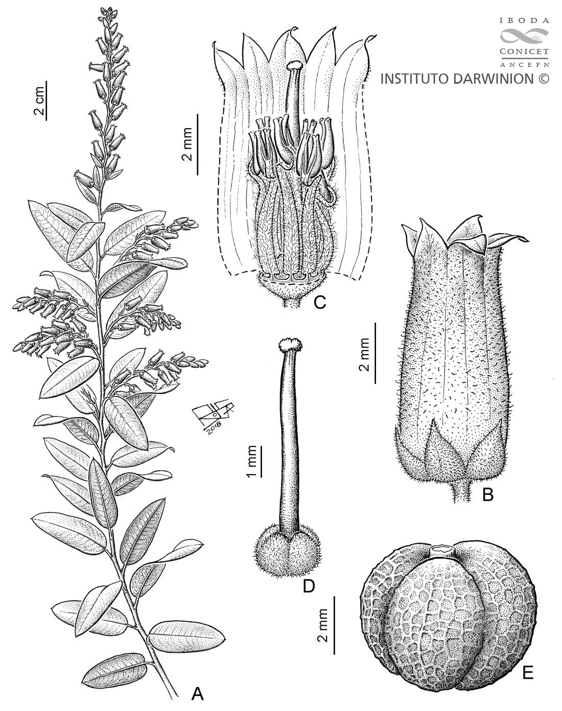 A. Rama florífera. B. Flor, vista lateral. C. Flor, corola desplegada mostrando el androceo, porción superior del estilo y estigma. D. Gineceo. E. Fruto.