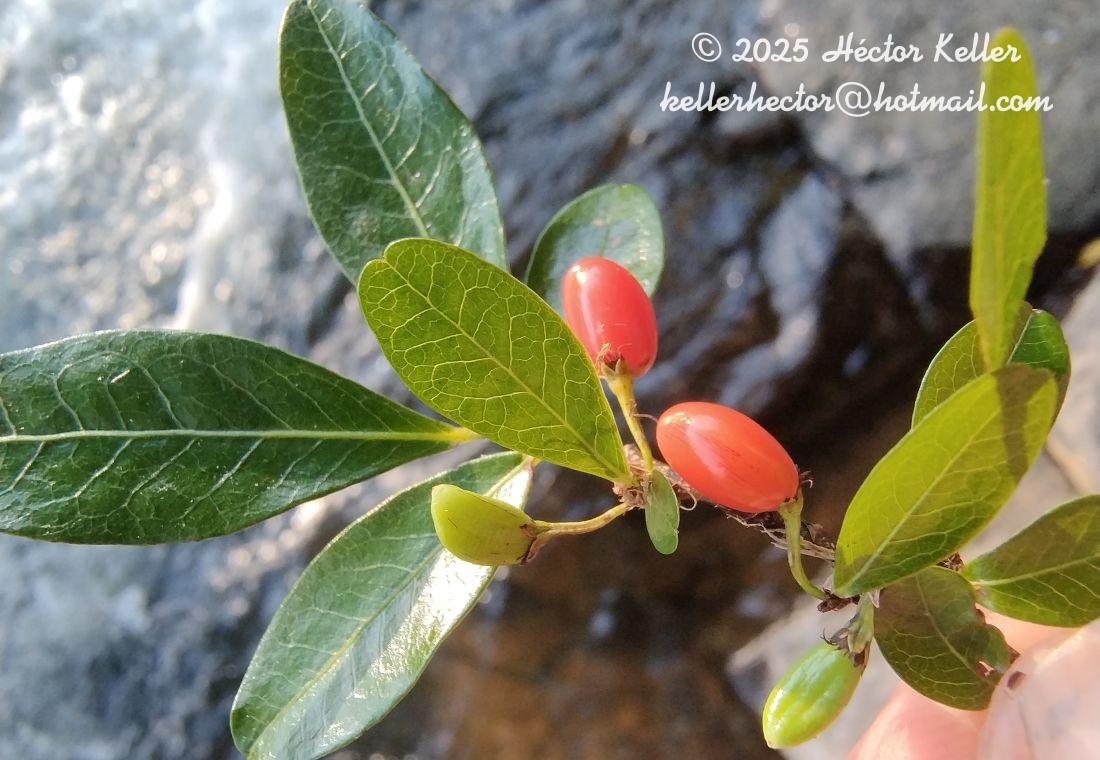 Arbolitos o arbustos hasta de 6 m de alto; troncos hasta de 12 cm de diámetro, glabros, corteza de color gris oscuro, densamente verrugosa. Hojas con pecíolos hasta de 3 mm de largo; láminas obovadas a elípticas, de 10-40 × 5-20 mm, base atenuada, ápice redondeado, obtuso o retuso, cartáceas o subcoriáceas cuando adultas, nervio central prominente y los secundarios evidentes en ambas caras; estípulas persistentes, lanceoladas, hasta de 5 mm de largo, 2-fidas en el ápice, enervias. Fascículos 1-4(-5)-floros, sobre braquiblastos axilares de hojas caídas; pedicelos claviformes, ensanchados hacia el ápice, de 3- 6 mm de largo. Sépalos subtriangulares, ca. 1 mm de largo; pétalos libres, elípticos, de 5 × 3 mm, unguiculados, de color verde amarillento, con lígula 2-lobada en la haz; flores brevistilas con filamentos estaminales unidos en la base formando un tubo de 1 mm de largo, porción libre de 1-3 mm de largo; flores longistilas con estambres desiguales, los alternipétalos ca. 1,4 mm de largo y los opositipétalos ca. 2,3 mm de largo, anteras elipsoides u oblongas, de dehiscencia longitudinal; ovario glabro, rodeado por el tubo estaminal; estilos filiformes, de 1-3 mm de largo; estigma capitado. Drupas elipsoides, de 3-6 × 1-3 mm, rectas o levemente curvadas, glabras, rojas, con cáliz y resto de filamentos estaminales persistentes. Semillas de 4-6 mm de largo.