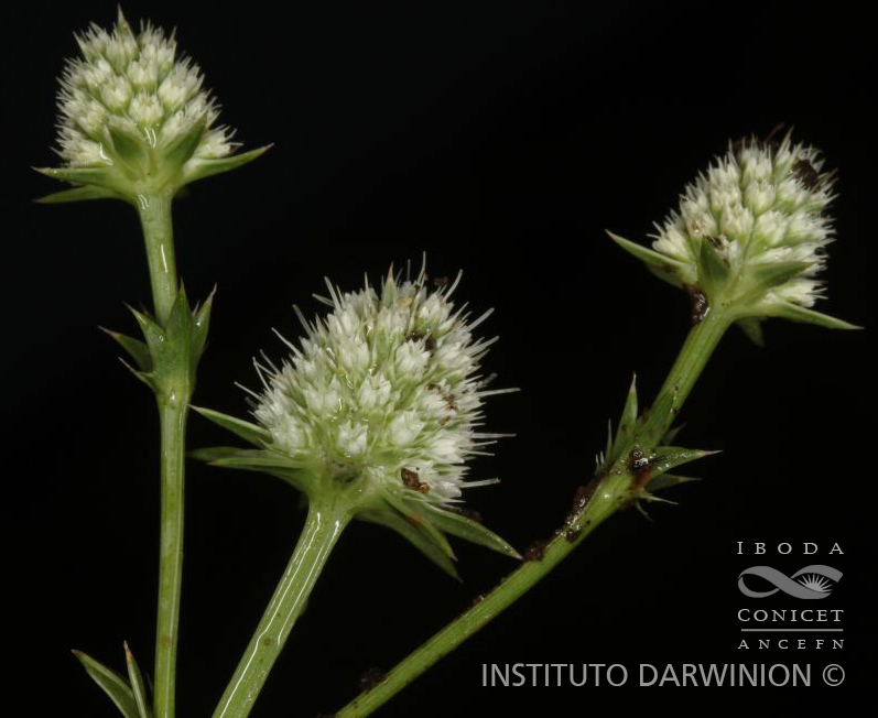 Hierbas perennes, de 12-60 cm de alto; raíces fasciculadas, gruesas, más o menos tuberosas. Tallo primario erecto, grácil, ramificado en una cima terminal hasta 6-furcada. Hojas basales tendidas a ascendentes, coriáceas, pecioladas, pecíolos de 1-5 cm de largo; láminas oblongo-espatuladas a obovadas, de 3-9 × 1-3 cm, ápice obtuso, margen crenado o serrado, con o sin cilias entre los dientes, hasta irregularmente pinnatisectas, liradas; venas paralelas en el centro de la lámina, divergentes y reticuladas hacia los márgenes; hojas caulinares y profilos sésiles, de 0,5-4 cm de largo, irregularmente dentado espinosos, coriáceos. Capítulos blancos, hemisféricos o anchamente ovoides, de 5-15 mm de diámetro; involucro evident e, brácteas involucrales patentes, coriáceas, subuladas, de 5-15 mm de largo, enteras o espinoso-serradas, punzantes; brácteas florales lineares, agudas, mayores que los frutos. Frutos de 1,5-2 mm de diámetro, cubiertos de vesículas cónicas, agudas.