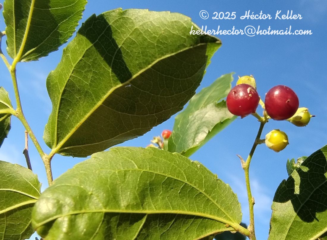 Arbustos o pequeños arbolitos, de 1-3 m de alto; ramas divaricadas, ceniciento-rojizas, con lenticelas redondas. Hojas con pecíolos de 1,8-2,8 mm de largo; láminas ovadas a ovado-oblongas, de 4,5-6,5(-10,5) × 2-3(3,8) cm, base redondeada, ápice acuminado, los márgenes glanduloso-aserrados, membranáceas, pubescentes a glabras; estípulas lanceoladas, caedizas. Panículas terminales de 2-3(-4,5) cm de largo, paucifloras; pedúnculos de 1-1,4 cm de largo, estos y el raquis pilosos; brácteas y bractéolas pequeñas. Flores pequeñas, blanquecinas; sépalos 3, ovados, de 2,8-3,1mm de largo, cortamente pilosos en ambas caras; pétalos 3, ovados, ca. 3 mm de largo; estambres numerosos, anteras pequeñas, amarillas; ovario ovoideo, glabro; estilo ca. 1 mm de largo; estigma 3-lobado. Bayas globosas, de 0,8-1,1 mm de diámetro, negruzcas, rodeadas en la base por el perianto persistente. Semillas numerosas, de contorno oblongo, de 1,3-1,6 mm de largo.