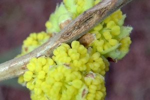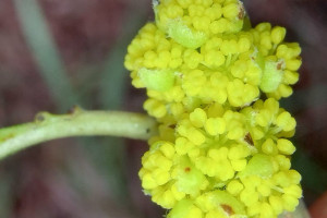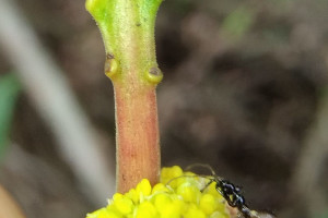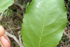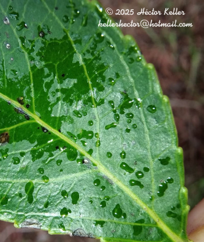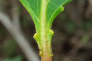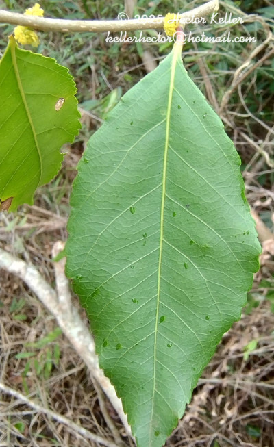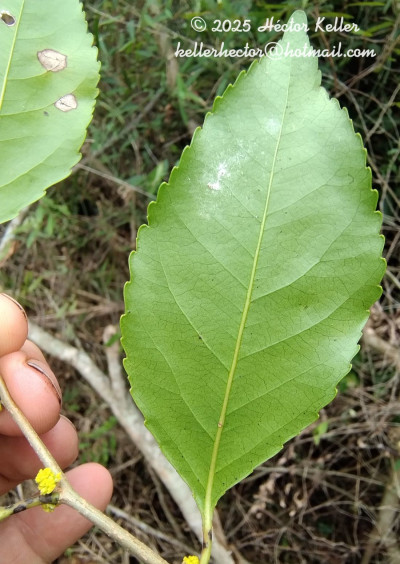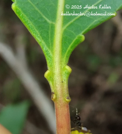 Arbolitos o arbustos dioicos, de 1,5-5 m de alto, copa más o menos globosa, corteza pardo-grisácea, leñoso-corchosa; ramas menores arqueadas o levemente flexuosas, con corteza pubérula, pardo-rojiza a grisácea, a veces algo blanquecina, con surcos longitudinales; lenticelas ovales, lineares o fusiformes, blanquecinas; espinas simples o ramificadas, rígidas, multinodales, de 1-5 cm de largo. Hojas con pecíolos de sección semicircular, de 0,4-1,6 cm de largo, pubérulos; láminas en su mayoría ovadas, ovado-lanceoladas, orbiculares o casi rómbicas, de 4,5-9,3 × 2-5,1 cm, base atenuada con 1 glándula de cada lado, ápice acuminado o no, generalmente obtuso o retuso, raro agudo, márgenes irregularmente crenado-aserrados, con 1 glándula redonda a ovalada, castaña o negra, en el envés de cada lóbulo; levemente discoloras, cartáceas, glabras a subglabras, a veces pubérulas sobre la porción basal del nervio medio; nervadura muy marcada, prominente en ambas caras, sobre todo en el envés; estípulas triangulares, de 0,2-0,8 mm de largo, cónicas o planas, agudas, persistentes, castaño-rojizas, glabras o con un mechón de pelos blancos en la base. Espigas breves, 6-9-floras, solitarias o hasta 3 por nudo; brácteas ovadas, triangulares o lineares, de 1,1-2 mm de largo, planas o cóncavas, glabras externamente, subglabras a pubescentes internamente, con margen ciliado o con pelos algodonosos; pedicelos cilíndricos, de 1-7,7 mm de largo, con surcos longitudinales, algo ensanchados a la altura de la articulación, pubescentes, más profusamente por debajo de la articulación, algunos con 1 bractéola inserta a esa altura. Flores con (3-)5(-7) sépalos libres entre sí, ovados, elípticos, triangulares u orbiculares, de 0,8-2 mm de largo, agudos u obtusos, glabros o subglabros externamente, densamente vellosos internamente; disco siempre presente, crenado- lobulado, amarillo; flores estaminadas con 13- 31 estambres hasta de 3,8 mm de largo, filamentos aplanados, afinándose arriba, heterodínamos, anteras acorazonadas; flores pistiladas con ovario lacrimiforme, glabro; ramas estilares 3(2-4); estigmas recurvos, truncos. Frutos ovoideo-globosos, de 3,5-8 × 2,5-5,5 cm, negruzcos y brillantes, con sépalos y estilo persistentes. Semillas 4 o 5, ovoides, comprimidas, brillantes.
