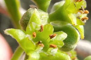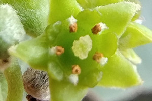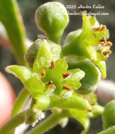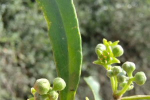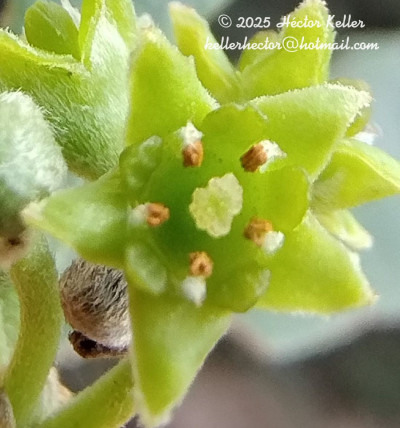 Árbol ca. 8 m de alto; tronco de 20-25 cm de diámetro; ramas inermes o con algunas espinas axilares rectas de 8-9 mm de largo. Hojas alternas, brevemente pecioladas; láminas lanceoladas, falcadas, de 5-13 × 0,6-1 cm, atenuadas en la base, de ápice obtuso hasta acuminado, nervadura central sobresaliente en toda su longitud. Inflorescencias en cimas paucifloras, de 10- 18 mm de largo, axilares, pubescentes; pedúnculo de 5-10 mm de largo; brácteas en la base de las flores, a veces reducidas, pubescentes. Flores perfectas, verdosas, perfumadas; perigonio campanulado, tubo breve con 5 lóbulos ovados, exteriormente pubescente; estambres con filamentos breves y anteras introrsas con pequeño mechón de tricomas detrás de cada una; disco nectarífero formado por 5 lóbulos carnosos interestaminales, un tercio más cortos que los lóbulos tepalinos; estilo delgado de 1-2 mm de largo, estigma algo achatado y brevemente lobulado. Fruto globoso, ca. 18 mm de diámetro, amarillenta.
