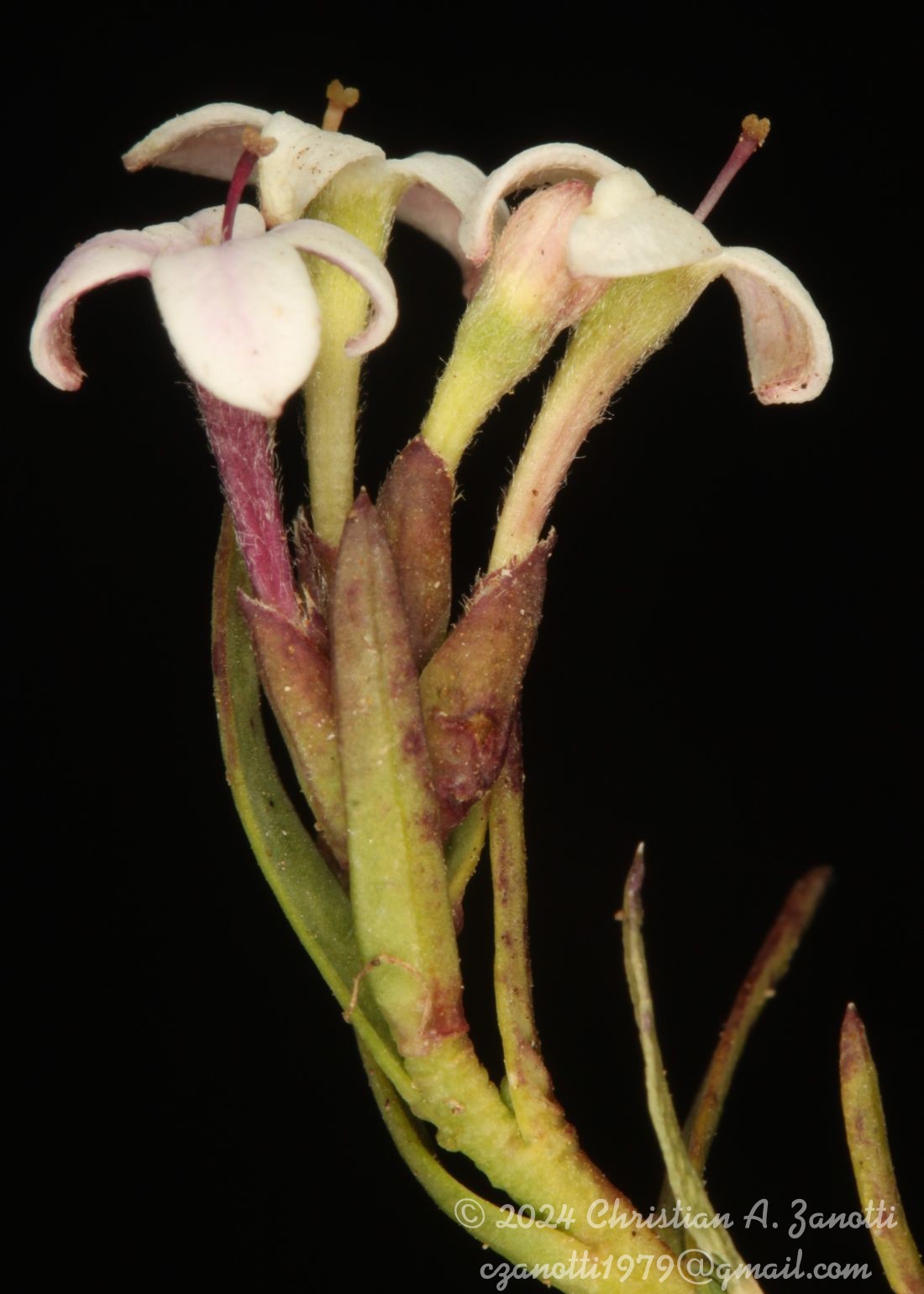 Hierba hasta de 15 cm de alto, decumbente, con rizomas tuberosos. Hojas de ramas floríferas lineares, de 5-15(-24) × 0,3-1,2 mm, 12-40 veces más largas que anchas, con 1 nervio, cartáceas, ascendentes a adpresas, recurvadas o no, margen plano, ápice mucronado y recto, glabras o a veces algo pubescentes; las hojas de ramas vegetativas subiguales. Inflorescencias en espigas paucifloras con 1-3(-4) flores; brácteas florales con cara abaxial glabra o escasamente pubescente, márgenes pubescentes, ápice acuminado y espinuloso. Flores blancas a purpúreas, de 11-12 mm de largo. Fruto ovoide.