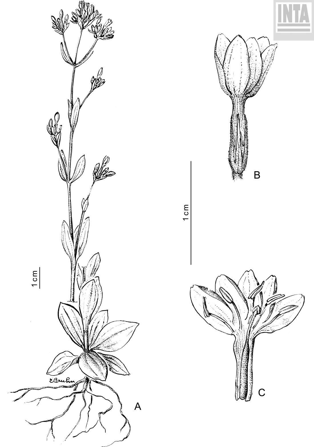 Hierba anual, de 15-50 cm de alto, tallos solitarios o ramificados, 4-gonos, erguidos. Hojas basales obovadas en roseta laxa y caediza, hojas caulinares elípticas hasta ovadas, agudas u obtusas, con 3-5 nervios sobresalientes en la cara abaxial, sésiles. Inflorescencia paniculiforme, la cima principal dicasial con la flor central sésil o subsésil, las cimas laterales monocasiales. Flores con cáliz de 5-7 mm de largo, casi de igual longitud que el tubo corolino, raras veces más corto; corola de 7-12 mm de largo, rosada o, a veces, blanca, tubo subcilíndrico, lóbulos elípticos de 2,5-4 mm de largo, agudos o con ápice eroso; anteras sagitadas, espiraladas helicoidalmente después de la antesis; gineceo con ovario fusiforme. Cápsula fusiforme. Semillas elipsoideas, de 0,2-0,4 mm de diámetro, castañas a marrones.
