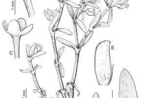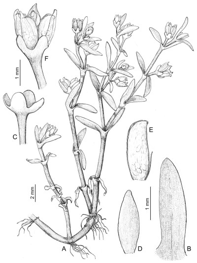 Hierba anual, pigmea, rastrera, carnosa; tallos hasta de 4 cm de ancho. Hojas con láminas linear-lanceoladas, de 1,5-3 mm de largo, ápice obtuso. Flores 4-meras, solitarias, pseudoaxilares; pedicelos de 1,5-2,5 mm de largo; sépalos de 0,4-0,8 mm de largo, subiguales, obtusos, carnosos; pétalos angostamente elípticos, de 1,2-2 mm de largo; escamas nectaríferas de 0,7 mm de largo; carpelos de 1,2-1,8 mm de largo, libres. Semillas 8-19, cilíndricas, de 0,24-0,36 × 0,15 mm, tuberculadas.