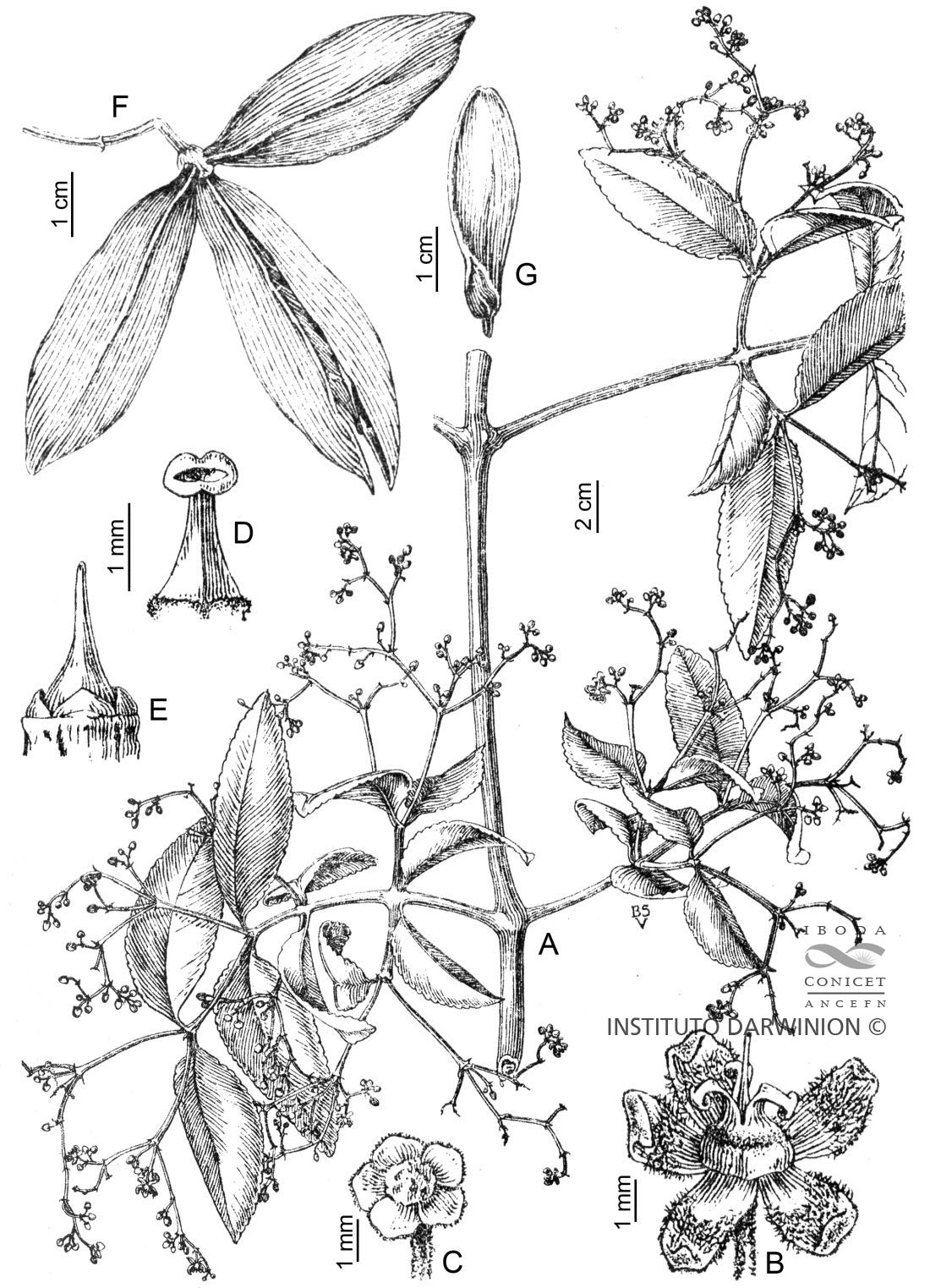 A. Rama florífera. B. Flor. C. Cáliz. D. Estambre. E. Gineceo. F. Fruto. G. Semilla. Tomado de Lilloa 31: 235, fig. 2; 237, fig. 3. 1962.