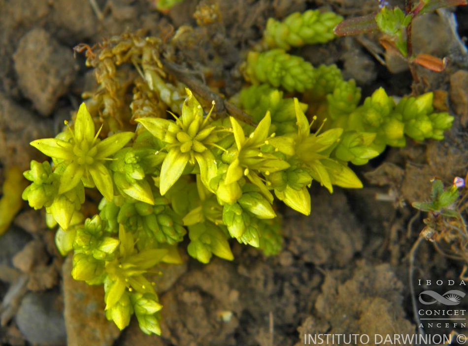 Hierba perenne de 4-12 cm de alto, glabra; raíces fibrosas; tallos rastreros, los floríferos ascendentes. Hojas alternas, subpeltadas a sésiles; láminas triangular-ovadas, de 2,8-6,2 × 2-3 mm, imbricadas, deciduas. Inflorescencias en cimas de 5-10 cm de largo, generalmente paucifl oras, terminales. Flores 5-meras; sépalos ovados, de 2-3,2 × 1-1,8 mm, desiguales, carnosos; pétalos oblongo-ovados a lanceolados, de 4,8-6 × 2,1-3,6 mm, brevemente connados en la base, membranáceos, amarillos; estambres 10, 2-seriados, los alternipétalos libres, los epipétalos connados en su tercio inferior a los pétalos; filamentos estaminales de 3,3-3,6 mm de largo; anteras de 0,5-0,6 mm de largo; ovario de 2-3 mm de largo, carpelos erguidos y connados en la base; estilo de 0,8-1 mm de largo. Frutos folículos de 4-4,5 mm de largo, patentes. Semillas ovoides a elipsoides, de 0,6-0,7 × 0,3-0,4 mm, alveoladas.