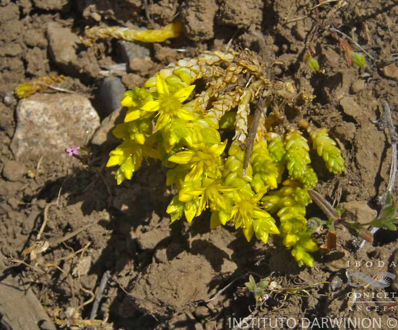 Hierba perenne de 4-12 cm de alto, glabra; raíces fibrosas; tallos rastreros, los floríferos ascendentes. Hojas alternas, subpeltadas a sésiles; láminas triangular-ovadas, de 2,8-6,2 × 2-3 mm, imbricadas, deciduas. Inflorescencias en cimas de 5-10 cm de largo, generalmente paucifl oras, terminales. Flores 5-meras; sépalos ovados, de 2-3,2 × 1-1,8 mm, desiguales, carnosos; pétalos oblongo-ovados a lanceolados, de 4,8-6 × 2,1-3,6 mm, brevemente connados en la base, membranáceos, amarillos; estambres 10, 2-seriados, los alternipétalos libres, los epipétalos connados en su tercio inferior a los pétalos; filamentos estaminales de 3,3-3,6 mm de largo; anteras de 0,5-0,6 mm de largo; ovario de 2-3 mm de largo, carpelos erguidos y connados en la base; estilo de 0,8-1 mm de largo. Frutos folículos de 4-4,5 mm de largo, patentes. Semillas ovoides a elipsoides, de 0,6-0,7 × 0,3-0,4 mm, alveoladas.