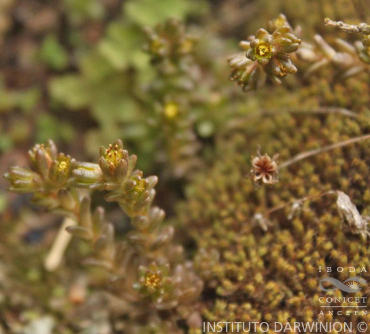Hierba perenne, glabra, erecta; raíces fibrosas, delgadas, que luego se endurecen y se engrosan; tallos floríferos de 1-12 cm de largo. Hojas con láminas elípticas, de 5-9,8 × 2-3,8 mm, espolonadas o no, mucronadas, papilosas hacia el ápice. Inflorescencias de 2-4 flores o solitarias, terminales o axilares, sésiles; sépalos 5, oblongos, de 3 × 1 mm, espolonados, valvados, libres, verdes; pétalos 5, lanceolados, de 3 × 1,5 mm, connados en la base formando un tubo de 1 mm de largo, blanco-amarillentos y con una carena dorsal rojiza; escamas nectaríferas 5, espatuladas, de 1 × 0,6 mm; gineceo de 2 mm de largo, atenuado en un corto estilo; carpelos 5, de 2,5 mm de largo, libres; estigma lobulado. Fruto 5-folicular, de 3,5 × 1,5 mm, con dehiscencia sutural simple. Semilla de 0,6 × 0,25 mm, episperma con alveolos poligonales.
