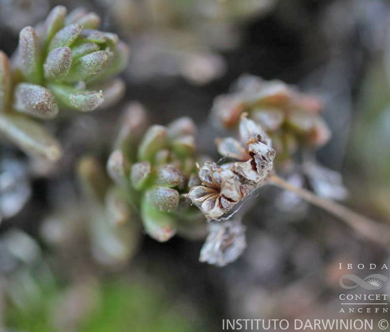 Hierba perenne, glabra, erecta; raíces fibrosas, delgadas, que luego se endurecen y se engrosan; tallos floríferos de 1-12 cm de largo. Hojas con láminas elípticas, de 5-9,8 × 2-3,8 mm, espolonadas o no, mucronadas, papilosas hacia el ápice. Inflorescencias de 2-4 flores o solitarias, terminales o axilares, sésiles; sépalos 5, oblongos, de 3 × 1 mm, espolonados, valvados, libres, verdes; pétalos 5, lanceolados, de 3 × 1,5 mm, connados en la base formando un tubo de 1 mm de largo, blanco-amarillentos y con una carena dorsal rojiza; escamas nectaríferas 5, espatuladas, de 1 × 0,6 mm; gineceo de 2 mm de largo, atenuado en un corto estilo; carpelos 5, de 2,5 mm de largo, libres; estigma lobulado. Fruto 5-folicular, de 3,5 × 1,5 mm, con dehiscencia sutural simple. Semilla de 0,6 × 0,25 mm, episperma con alveolos poligonales.