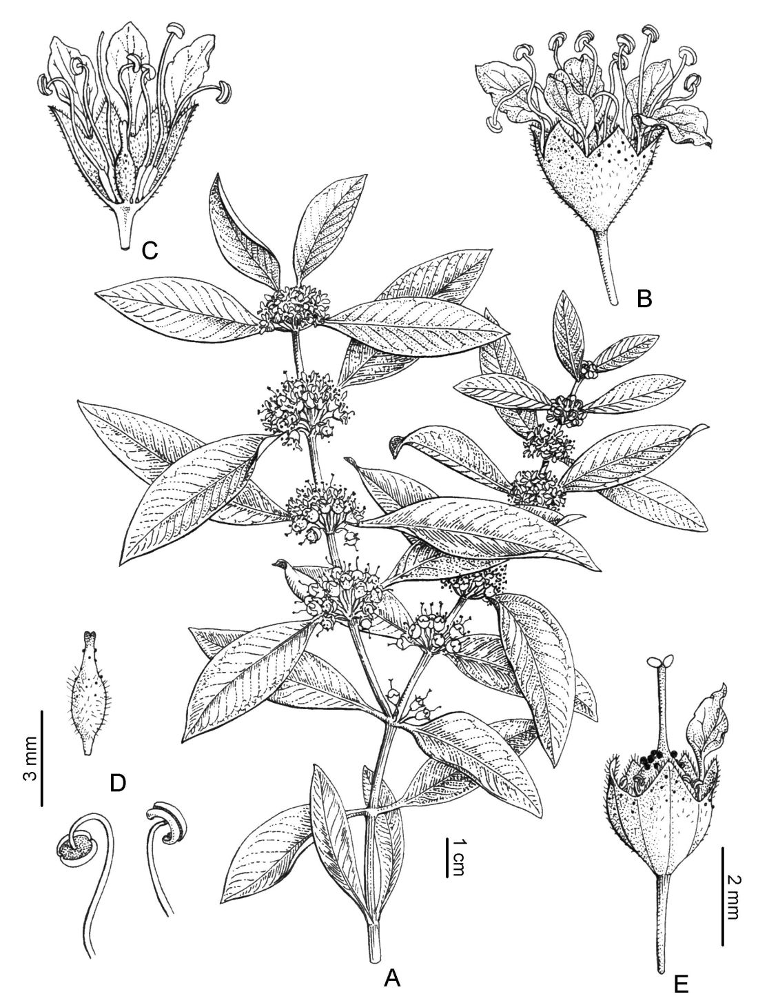 A. Rama florífera. B. Flor. C. Flor, sección longitudinal. D. Estambres y ovario. E. Flor fructificada. Tomado de Fl. Paraguay 40: fig. 1. 2010.