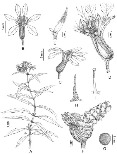 Hierba o subarbusto anual o perenne, hasta de 50 cm de alto; tallo erecto, por lo común leñoso, rojizo, muy ramificado desde la base; entrenudos de 1-4(-5) cm de largo; indumento de tricomas adpresos abundantes y tricomas glandulares escasos, cortos y de base bulbosa, raramente glabrescentes. Hojas opuestas, raramente alternas, subsésiles o con pecíolo de 1-5 mm de largo; láminas estrechamente lanceoladas a linear-lanceoladas, de (10-)15-50(-60) × 3-9(-12) mm, ápice agudo a mucronado, base atenuada, no decurrente en el pecíolo; indumento similar al del tallo, a veces glabrescente o con sólo tricomas adpresos, con escasos tricomas glandulares cortos sobre los nervios; margen estrigoso, a veces ligeramente ciliado, discoloras. Inflorescencia racimosa de (3-)4-12 cm de largo; brácteas linear-agudas, de (1,5-)1,8-7(-9) × 0,5-1,5 mm, sésiles o subsésiles, mucronadas, con indumento similar al de las hojas, a veces con tricomas glandulares largos y conspicuos. Flores opuestas, raro alternas; pedicelos de (4-)5-7,5(-10) mm de largo, con indumento similar al del tallo; tubo floral de (4-)6-8,5(-10) × 1,5-2,5 mm; lóbulos deltoides, el dorsal de 1-1,8 × 1,4-2,3 mm, los otros de 0,6-1,6 × 0,8-2,5 mm; apéndices intersepalinos de 0,3-0,5 mm de largo, glabros o con 1-3 tricomas rígidos, cortos; superficie externa con abundante indumento glandular corto sobre las costillas, raramente con otro tipo de tricoma; pétalos de 2,5-4(-6) × 1,2-2 mm, violáceos, subiguales, los dorsales comúnmente anchamente obovados, glabros, los ventrales elípticos a subespatulados, obtusos, glabros o con algunos tricomas en la base en la cara externa; estambres insertos ± en el tercio superior del tubo floral; ovario fusiforme, de 2,5-3,7 mm de largo, glabro, ligeramente viloso en el ápice, con 35-45 óvulos; estilo ca. 1 mm de largo, viloso y glabro en el ápice, incluso; estigma capitado, exerto después de la antesis; disco horizontal, de 1-1,5 mm de largo. Semillas 30-45 por cápsula, anchamente elipsoides a suborbiculares, de 1-1,5 × 0,9-1,2 mm, marginadas, castaño-rojizas o castaño oscuras.