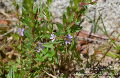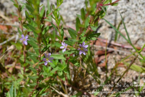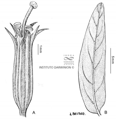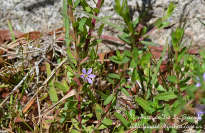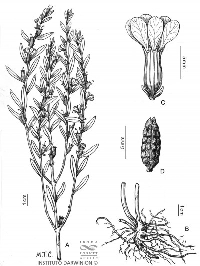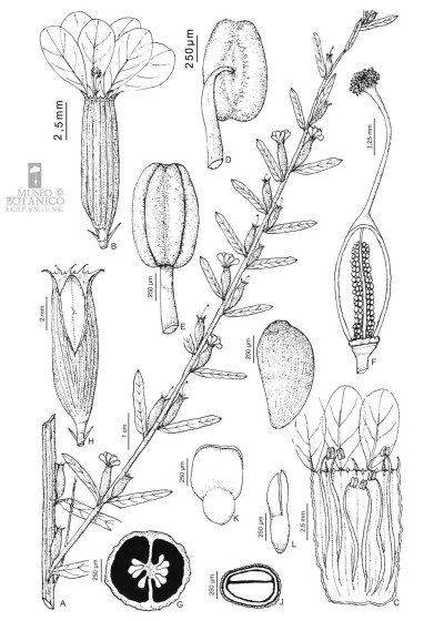 Hierba perenne o sufrútice, hasta de 1 m de alto, erecta; tallos ramificados, 4-gonos. Hojas alternas u opuestas, sésiles o subsésiles; láminas elípticas o angostamente ovadas, de 1,5-3 × 0,2-1 cm. Flores solitarias, axilares; bractéolas elípticas, ca. 1 mm de largo; tubo floral de 4-7 mm de largo, con 12 alas longitudinales, muy angostas, más notorias en el fruto; lóbulos deltoides; apéndices intersepalinos subulados; pétalos obovados, de 4-5,5 mm de largo, más cortos que el tubo floral, azul-violáceos; estambres 6, fijos cerca de la mitad del tubo floral, inclusos; ovario ± ovoide; estilo exerto, estigma en cabezuela; disco hipógino anular. Fruto una cápsula de 6-7 mm de largo, rodeada por el tubo floral. Semillas ca. 0,5 mm de largo, brillantes, oscuramente reticuladas, con tricomas mucilaginosos.