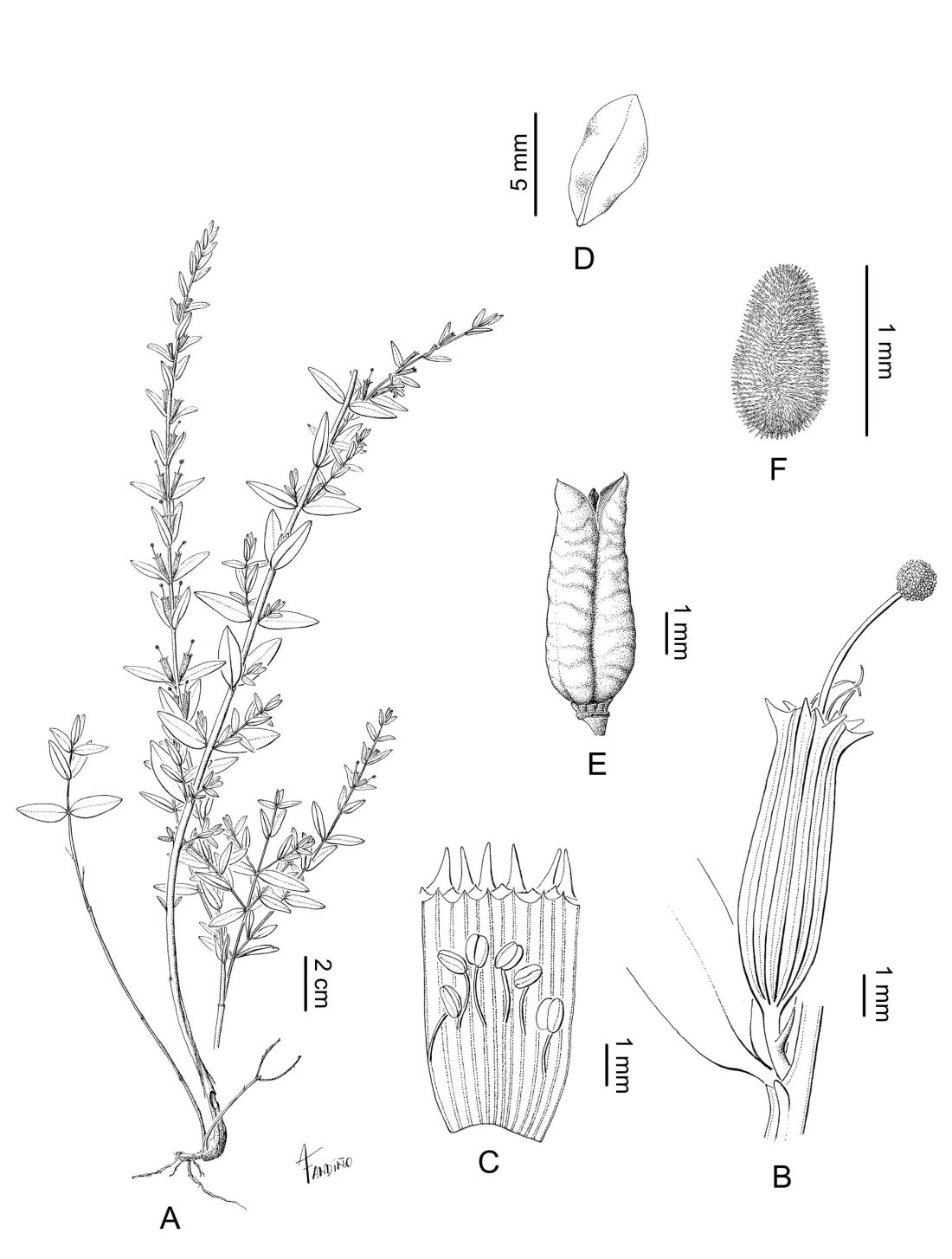 A. Planta. B. Flor postantesis. C. Flor desplegada sin los pétalos. D. Pétalo. E. Fruto. F. Semilla hidratada, vista dorsal.