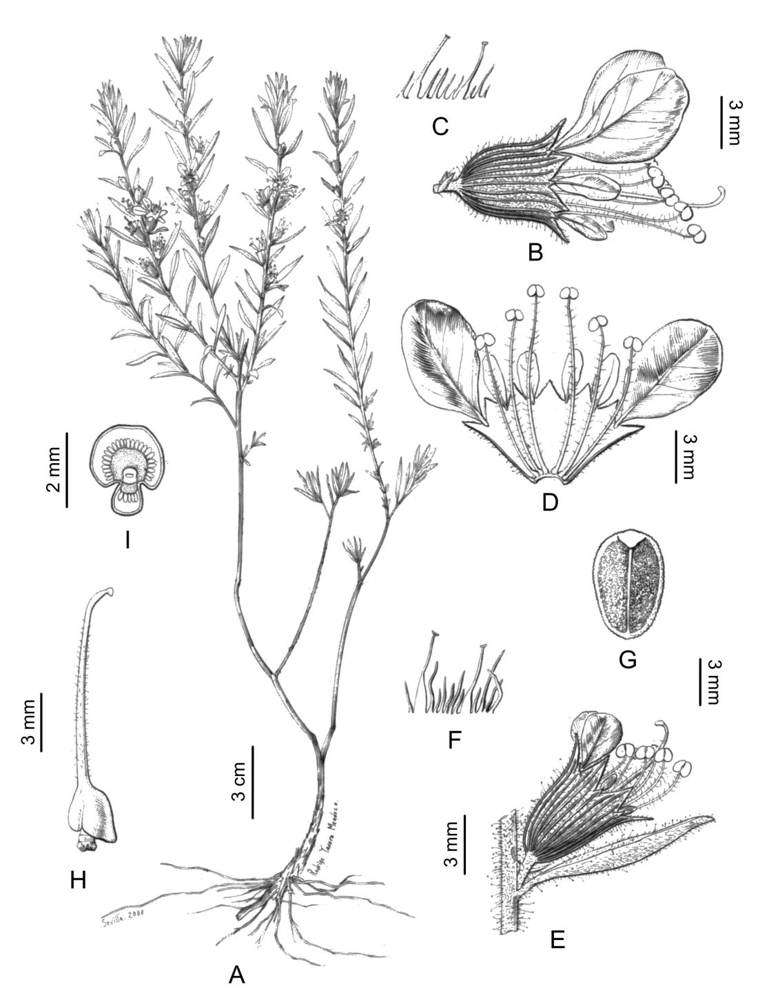 A. Planta. B. Flor, vista lateral. C. Detalle del indumento del tubo floral. D. Flor desplegada. E. Porción de la inflorescencia. F. Detalle del indumento de la flor. G. Semilla. H. Gineceo. I. Gineceo, sección transversal. Tomado de Fl. Paraguay 40: fig. 33. 2010.