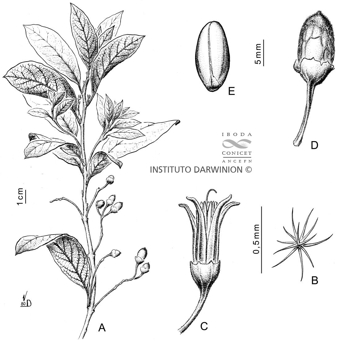 Árbol de 6-12 m de alto, las ramas jóvenes tomentosas, densamente cubiertas por tricomas estrellados ferrugíneos, ramas adultas glabrescentes. Hojas ovado-oblongas o elíptico-lanceoladas, de 3-12 × 2-4 cm, base aguda o cuneada, ápice agudo, cara adaxial glabra, cara abaxial densamente argenteo-tomentosa, con tricomas estrellados densos y ferrugíneos sobre las nervaduras principales, papiráceas, discoloras; pecíolo tomentoso de 5-15 mm de largo. Inflorescencia en racimos axilares de 2-4 cm de largo, con 2-6 flores, raquis pubescente, cubierto por tricomas estrellados amarillentos. Flores de 1-1,5 cm de largo, pedicelos de 5-8 mm de largo; cáliz de 3-4,5 × 3-3,5 mm, cortamente 5-denticulado, densamente cubierto con tricomas estrellados grisáceos; corola con tubo de 1,5-2 mm de largo, lóbulos erectos de 8,5-11,5 × 1,5-2 mm, rojizos, densamente argénteo-tomentosos en el exterior e interiormente con tricomas blancos en el ápice y glabrescentes hacia la base; estambres de 7-8,5 mm de largo, filamentos pubescentes, anteras ca. 5,5 mm de largo, con tricomas estrellados en el margen; estilo filiforme, glabro. Fruto una drupa elipsoide u obovoide, de 1-1,3 × 0,8-0,9 cm, el cáliz persistente. Semilla 1, elipsoide, ca. 12 × 6 mm, castaña.
