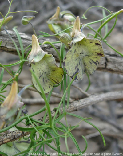 Hierbas perennes, trepadoras, glabras; tubérculos globosos de 1,5 cm de diámetro. Hojas peltadas (céntricas), simples, palmatisectas; lóbulos 3-4, lineares, de 0,3-3,5 × 0,03-0,1 cm, enteros, inermes, sésiles; pecíolos de 0,6-2,5 cm de largo. Flores con pedicelos de 0,3-3,5 cm de largo; cáliz amarillo-verdoso a negruzco, lóbulos 5, de 3-7 mm de largo, espolón conspicuo, cónico, de 3-7 mm de largo, recto, ápice obtuso a agudo; pétalos amarillos con venas púrpuras, los superiores 2 de 5-8 × 2-3 mm, espatulados, emarginados, pétalos inferiores 3, de 4-7 × 2-4 mm, unguiculados, lámina ondulada y/o emarginada, sin lacinias, con 2 aurículas en la base, involutas, formando un bolsillo; estilo con una rama estigmática más desarrollada que las otras. Fruto sámara castaño clara, anchamente 3-alada.