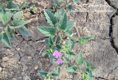 Hierbas rastreras de 20-60 cm de alto, erectas, hirsutoglandulosas; entrenudos de 3,5-6 cm de largo. Hojas con pecíolos de 5-12 mm de largo; láminas de 2-4 x 1,5-2 cm, ovadas a subtriangulares, enteras, base cuneada, ápice agudo, margen serrado, ambas superficies estrigosas. Sinflorescencias en pleiobotrios heterotéticos con 1 par de paracladios frondosos que sobrepasan o no la florescencia principal o en monobotrios, formada por espigas multifloras densas, algo alargadas a la madurez de los frutos, pedúnculos de 7-25 mm de largo. Brácteas florales de 3,5-4 mm de largo, angostamente ovadas, híspidoglandulosas. Cáliz de 9,5-10 mm de largo, híspido-glanduloso, dientes de 1,5 mm de largo; corola de 12 mm de largo, rojiza, rosada o lila, externamente glabra o pubescente, fauce pubescente; par superior de estambres sin apéndices conectivales; estilo de 10 mm de largo. Clusas de 6 mm de largo, ápice rostrado, base no angostada y con repliegue basal y transversal de la pared comisural, superficie externa reticulada hacia el ápice, acanalada en el resto.
