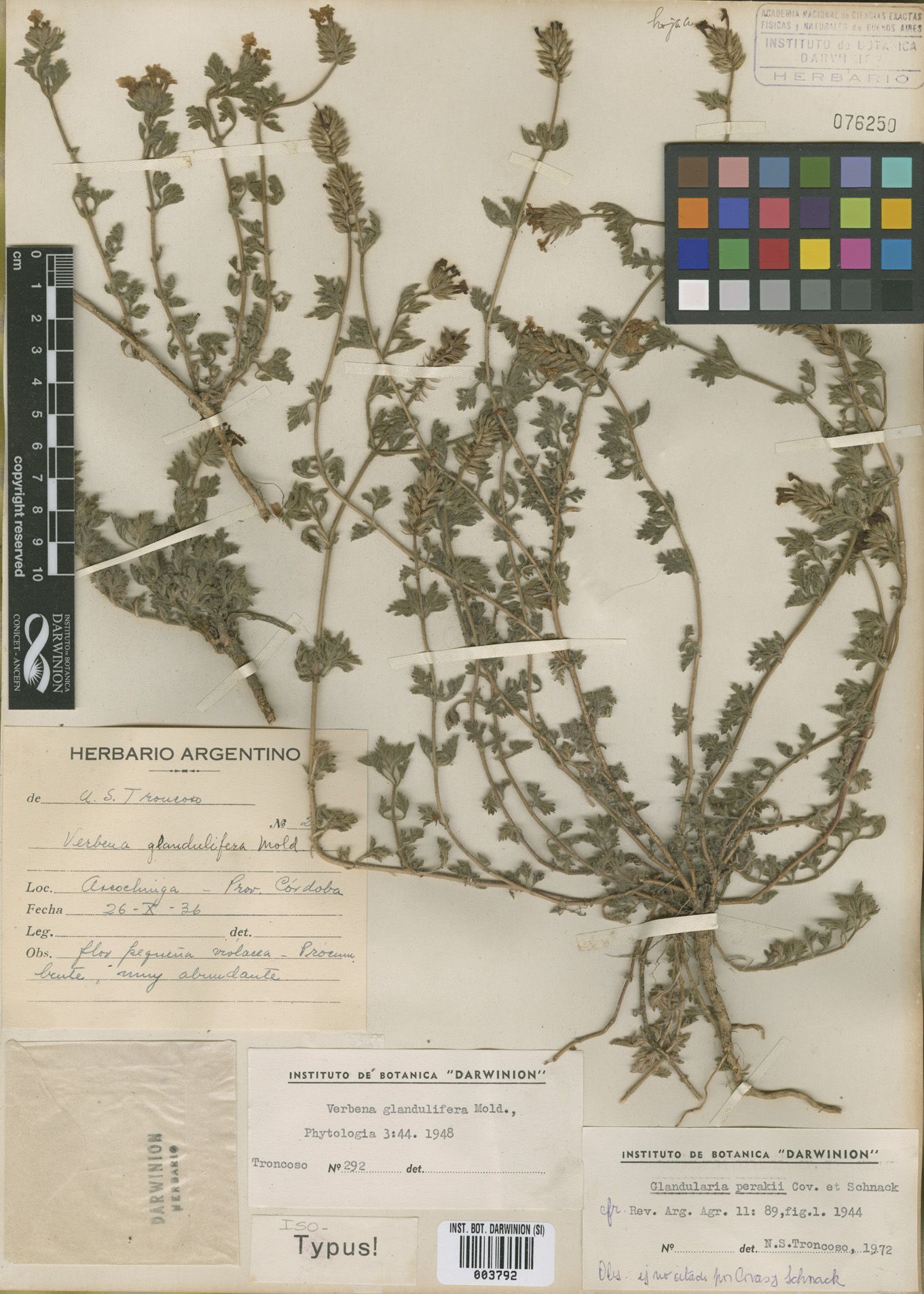 Observaciones: Glandularia venturii se caracteriza por la pubescencia híspido-glandulosa en tallos, hojas, brácteas y cálices.