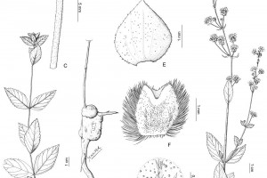 Sufrútices ca. 60 cm de alto, con xilopodio leñoso; entrenudos de 6-7 cm de largo, estrigosos. Hojas simples, ternadas, con pecíolo de 1-2 mm de largo; láminas elípticas de 2-4,5 x 1-2,5 cm, base obtusa, ápice agudo, margen entero en el tercio inferior y aserrado en el superior, escasamente escaborsas, con pelos cortos sobre las venas principales en la cara abaxial. Sinflorescencias en pleiobotrios heterotéticos bracteosos, ca. 20 cm de largo; florescencias en espigas capituliformes, 2-4 por nudo, ca. 5 mm de diámetro; pedúnculo de 1-2 cm de largo; brácteas de las sinflorescencias foliáceas, elípticas, agudas, de 2-2,5 x 1 cm, margen aserrado, las superiores de 0,5-1 cm de largo, con margen entero; brácteas anchamente elípticas, de 2,6-3,3 x 1,8 mm, margen apenas aserrado. Cáliz comprimido de 2,5 x 1,6 mm, con alas en los márgenes laterales de 0,5 mm de largo, ciliadas; corola blanca, infundibuliforme, de 5-6 mm de largo, tubo de 3,3 mm de largo, lóbulos de 1,6 mm de largo. Fruto ovoide de 3 x 2,5 mm, de superficie lisa.