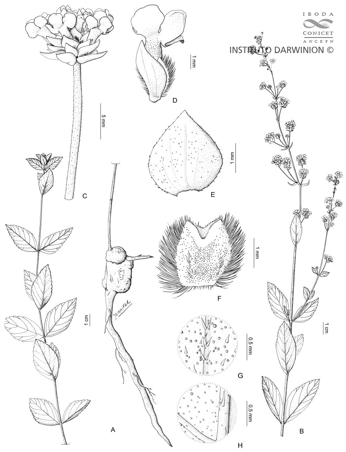 A. Xilopodio y extremo de una rama. B. Rama florífera. C. Florescencia parcial. D. Flor y bráctea. E. Bráctea. F. Cáliz. G. Hoja, detalle de la pubescencia de la cara abaxial. H. Hoja, detalle de la pubescencia de la cara adaxial.