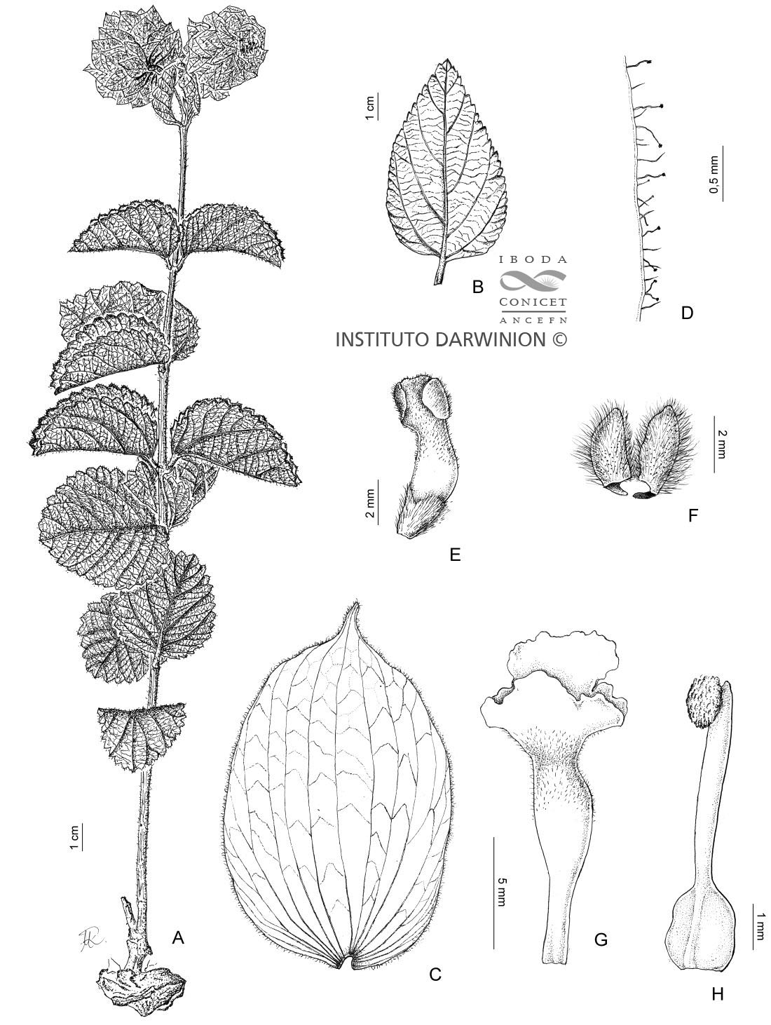 A. Planta. B. Hoja. C. Bráctea. D. Bráctea, detalle del margen. E. Pimpollo. F. Cáliz. G. Corola. H. Gineceo.