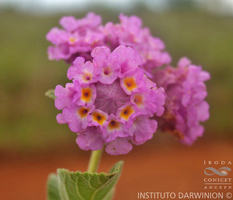 Sufrútices hasta de 40 cm de alto; xilopodio leñoso; tallos velutinos, con entrenudos de 3-8 cm de largo. Hojas opuestas, de 4-6 x 3-4 cm, anchamente ovadas, base redondeada, ápice agudo, margen aserrado, velutino-glandulosas en ambas caras, más densamente en la abaxial. Sinflorescencias en pleiobotrios homotéticos frondosos; florescencias parciales en espigas capituliformes esféricas de 3 cm de diámetro, generalmente una por nudo; pedúnculos de 3-4 cm de largo; brácteas rosadas, de 1,5-2 x 1-1,2 cm, anchamente ovadas, base redondeada o cordiforme, ápice agudo o acuminado, ciliadas y glanduloso- pubescentes. Flores de 1-1,5 cm de largo; cáliz persistente, de 2- 3 mm de largo, villoso; corola hipocraterimorfa, exteriormente rosa y villoso-glandular, interiormente el tubo es amarillento, ca. 1 cm de largo y con lóbulos ca. 0,5 cm de largo; estambres adnatos en la mitad el tubo, filamentos breves, anteras de 1 mm de largo; gineceo glabro ca. 9 mm de largo. Fruto obovoide, de 3 mm de largo; clusas con paredes lisas.