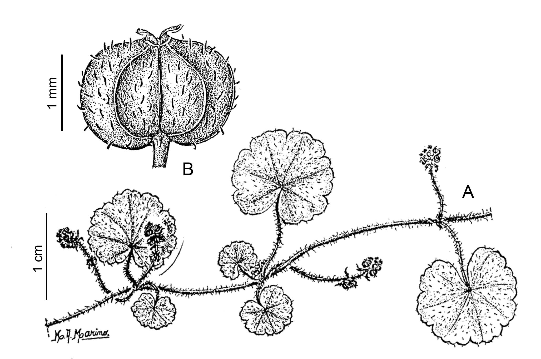 Plantas perennes, pequeñas, delicadas; tallos rastreros, superficiales o subterráneos, filiformes, hirsutos. Hojas paláceas, pecíolos hasta de 3,5 cm de largo, hirsutos; lámina orbicular a reniforme, de 0,5-2,5 cm de diámetro, 9-11-nervada, débilmente 7-9-lobada, hirsuta en ambas caras, lóbulos obtusos, crenados o dentados, seno basal ± angosto, alcanzando el pecíolo. Inflorescencia espiciforme, formada por 2-3 verticilos paucifloros, dispuestos a lo largo del raquis, distando entre sí 2-5 mm; pedúnculos menores que la hoja opuesta. Flores subsésiles, pétalos amarillo-verdosos, a veces con pintas rosadas, estilos breves, ca. 0,3 mm. Frutos reniformes, de 0,5-1 × 1,2-2 mm, con costillas dorsales y laterales evidentes, agudas; hispiduloso.